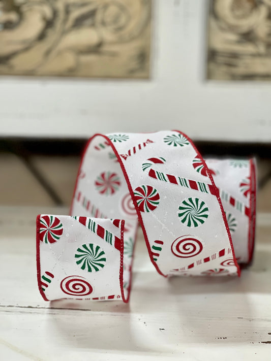 2.5 Inch By 10 Yard Red And Green Candy Cane And Peppermint Ribbon