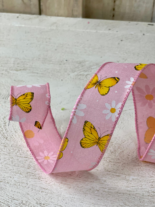 1.5 Inch By 10 Yard Pink Linen With White Daisies and Yellow Butterflies Ribbon