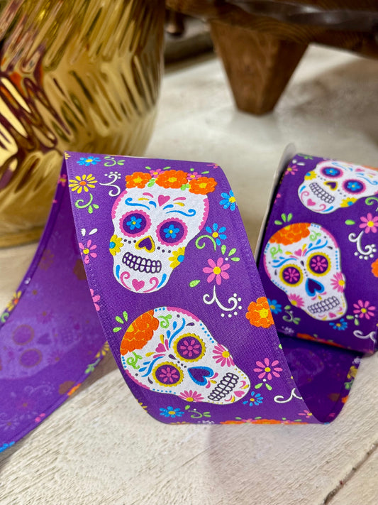 2.5 Inch By 10 Yard Purple Day Of The Dead Skulls Ribbon