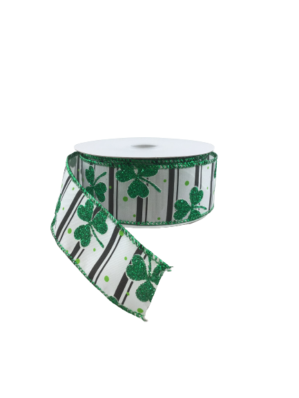 1.5 Inch By 10 Yard White Satin With Black Stripes And Shamrocks Ribbon