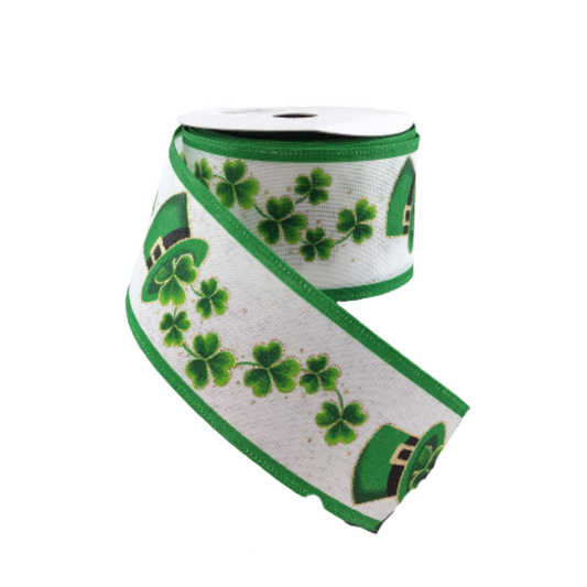 2.5 Inch By 10 Yard White Linen Shamrocks St. Patrick Hat Ribbon