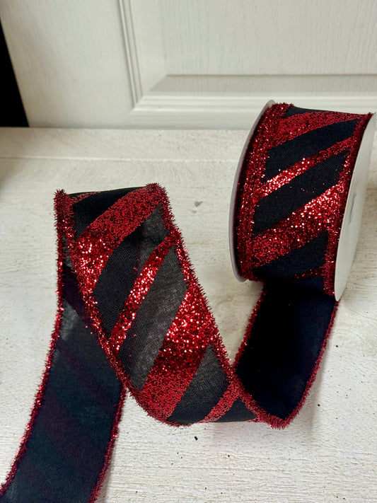 2.5 Inch By 10 Yard Black And Red Glitter Diagonal Stripe Ribbon With Tinsel Edging