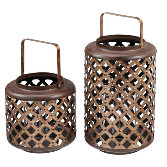 Set of 2 Antiqued Bronze Lattice Candle Hanging or Tabletop Lantern