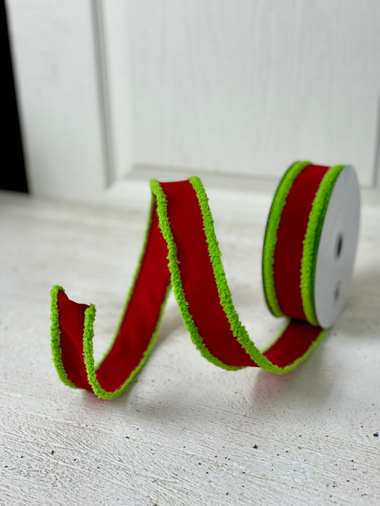 1.5 Inch By 10 Yard Red Velvet With Green Drift Edging Ribbon
