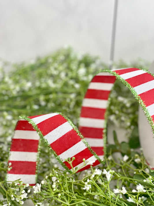 1.5 Inch By 10 Yard Ribbon Red And White Stripe With Green Tinsel Edge Ribbon
