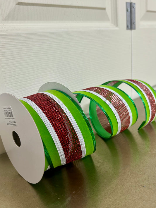 1.5 Inch By 10 Yard Lime White Flat All Glitter Candy Cane Stripe Ribbon