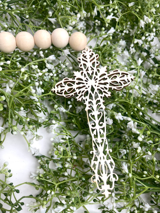 9.5 Inch Natural Wood Bead With Cross Ornament