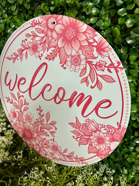 12 Inch Pink And White Metal Chinoiserie Welcome Sign