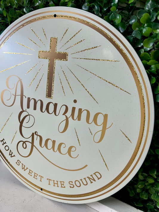 24 Inch Light Cream And Gold Amazing Grace Glitter Metal Sign