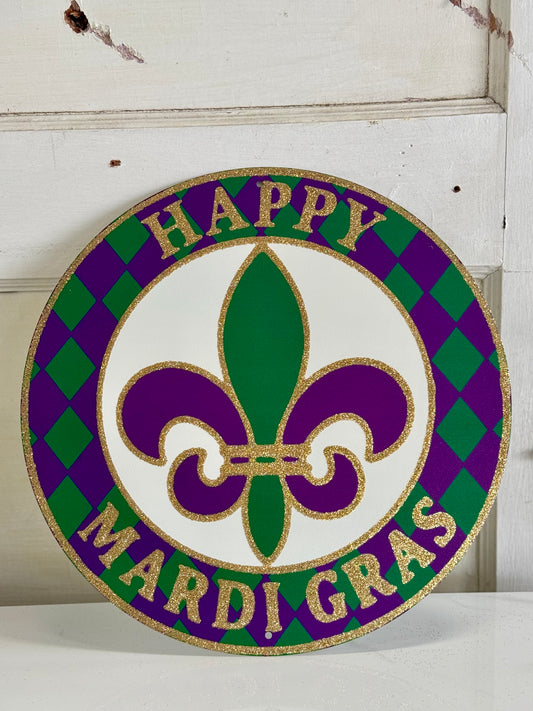12 Inch Round Metal "Happy Mardi Gras" Sign with Glitter