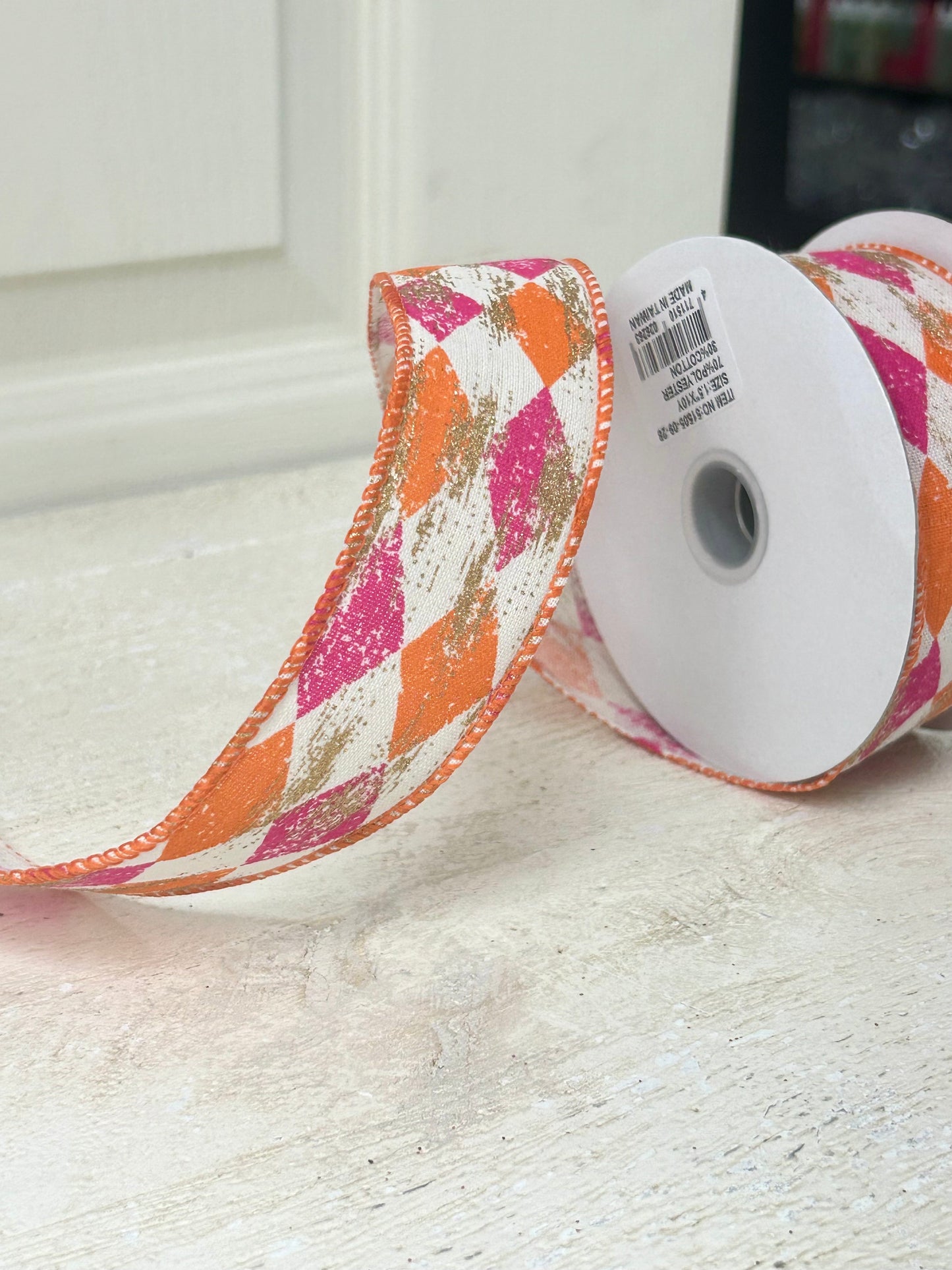This 1.5-inch by 10-yard ribbon features a cream canvas background with a faded harlequin pattern in orange and fuchsia, highlighted by gold metallic details and orange edging. Perfect for spring and summer, it brings a sophisticated, festive touch to Easter decorations, gift wrapping, and seasonal crafts. The elegant blend of colors and metallic shimmer enhances your projects with expert precision and style.