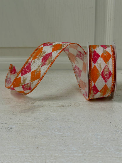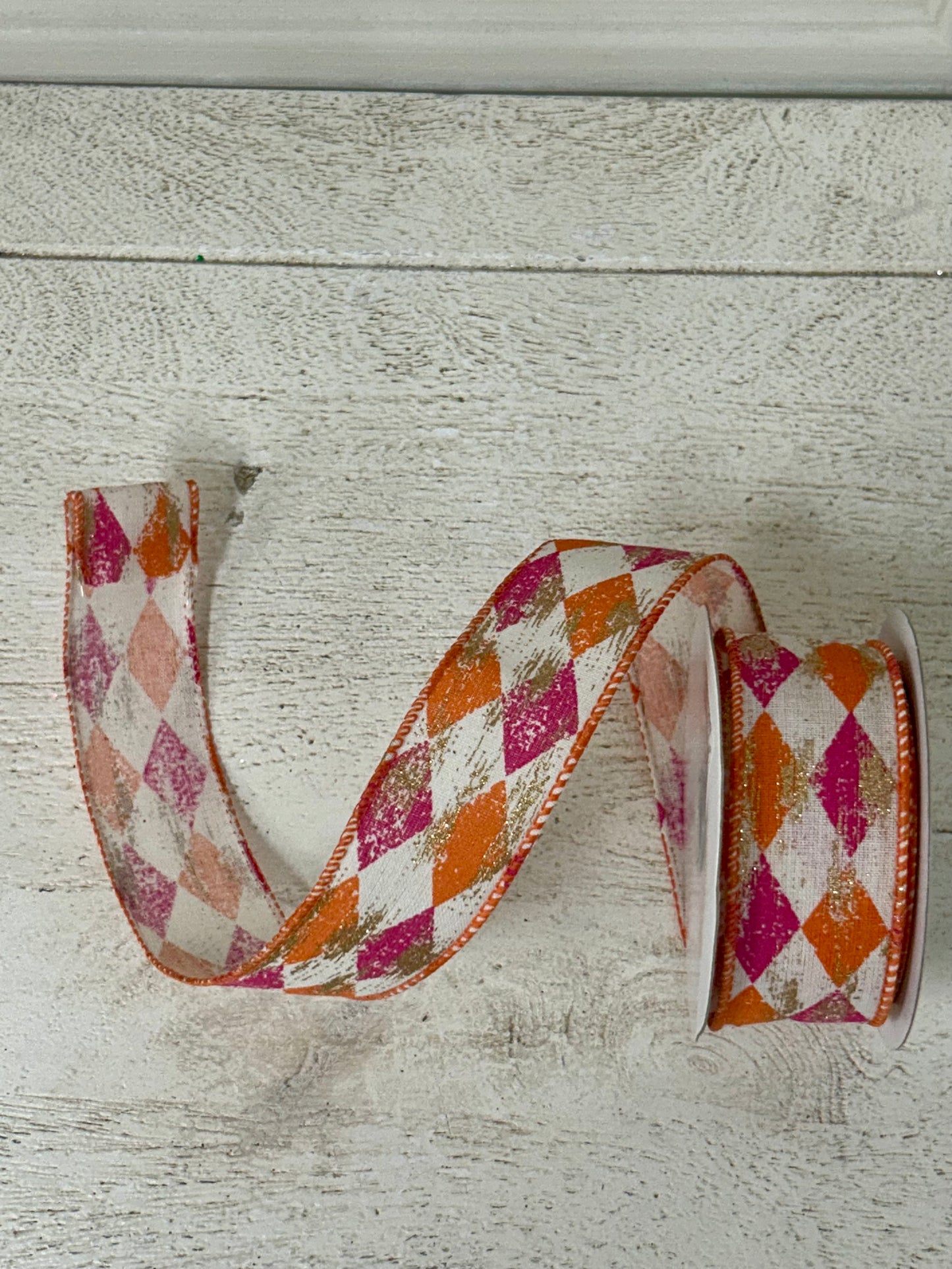 1.5 Inch By 10 Yard Cream Background Orange And Fuchsia Faded Harlequin Gold Metallic Ribbon
