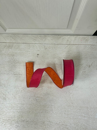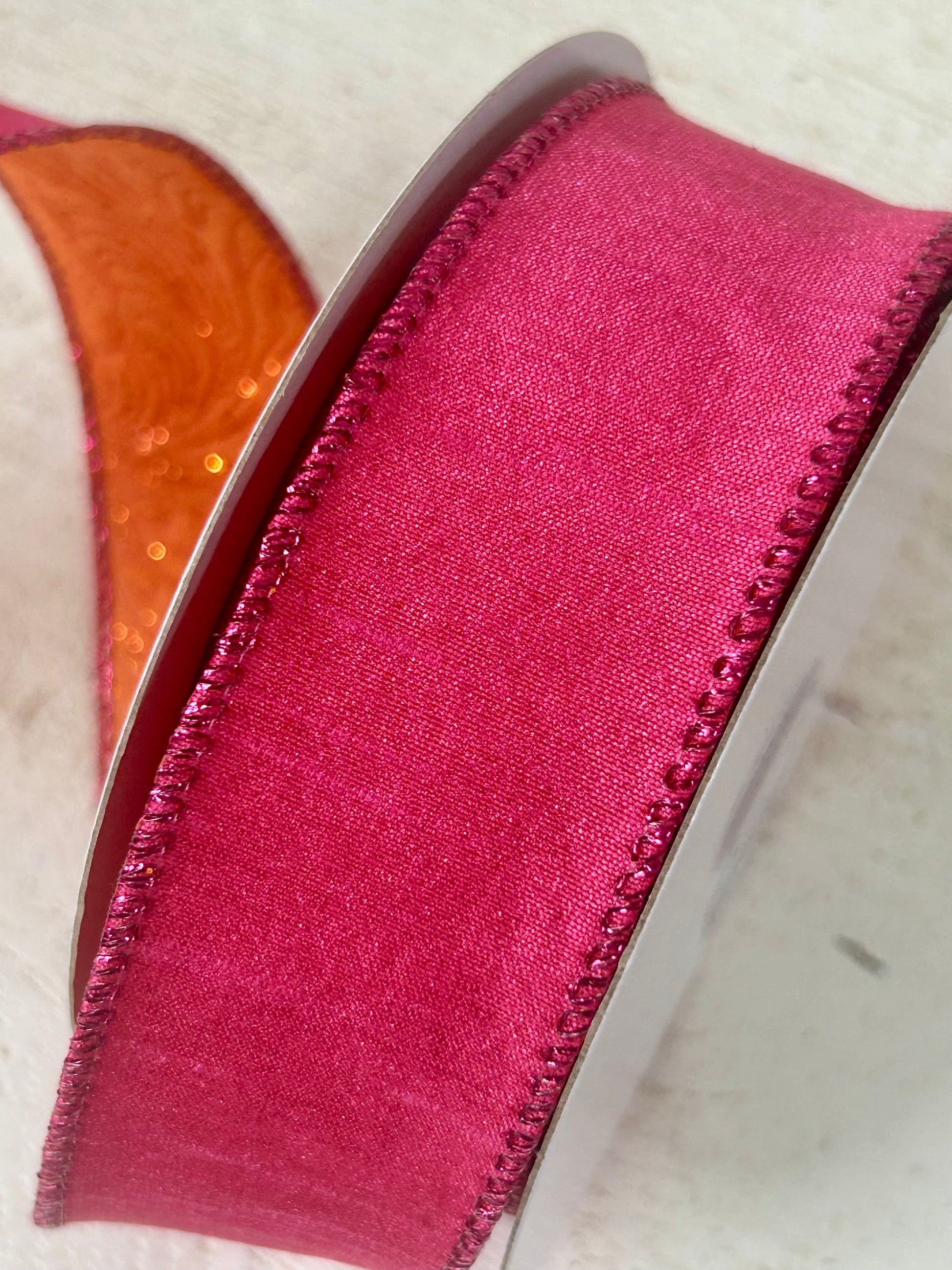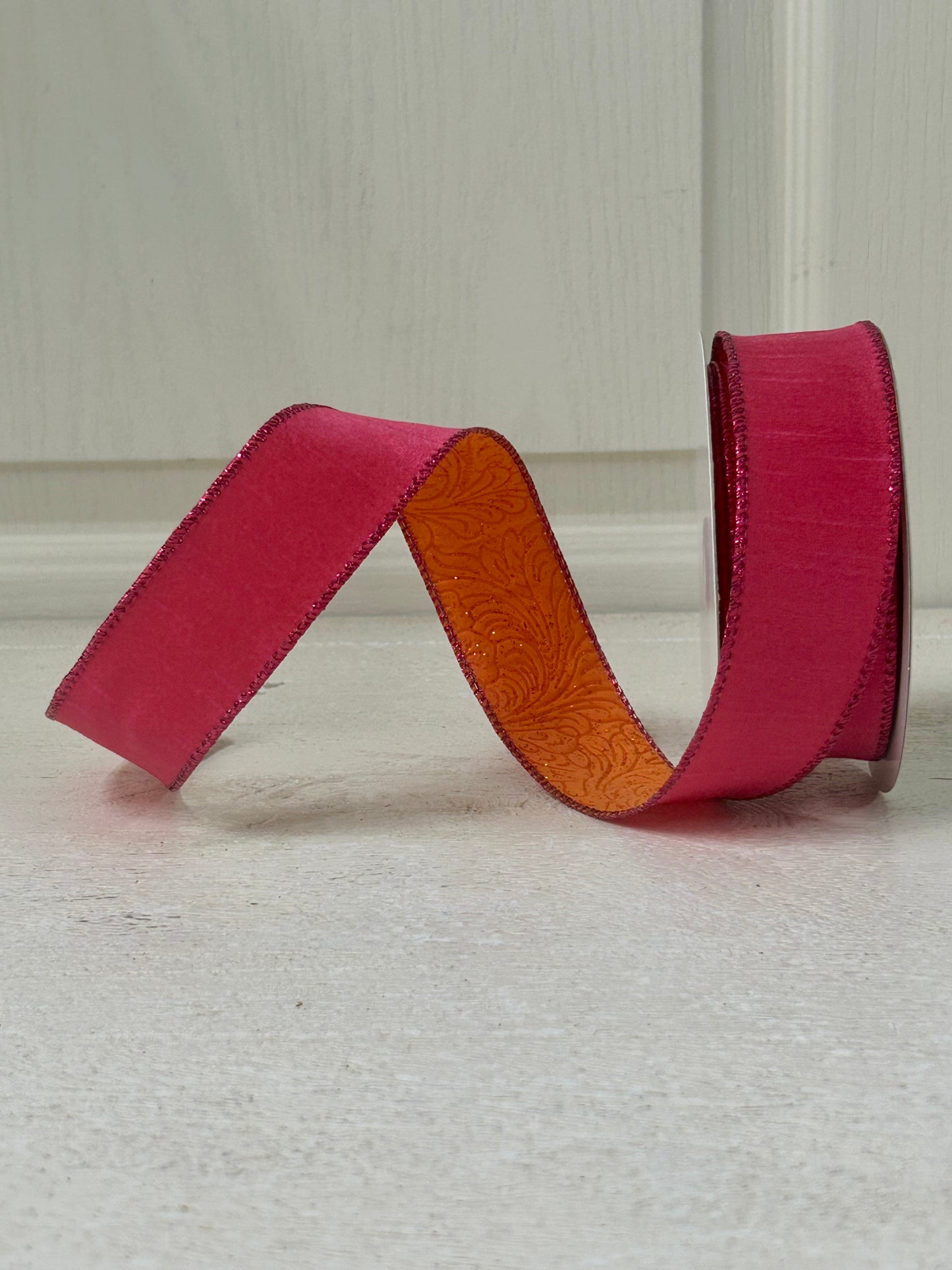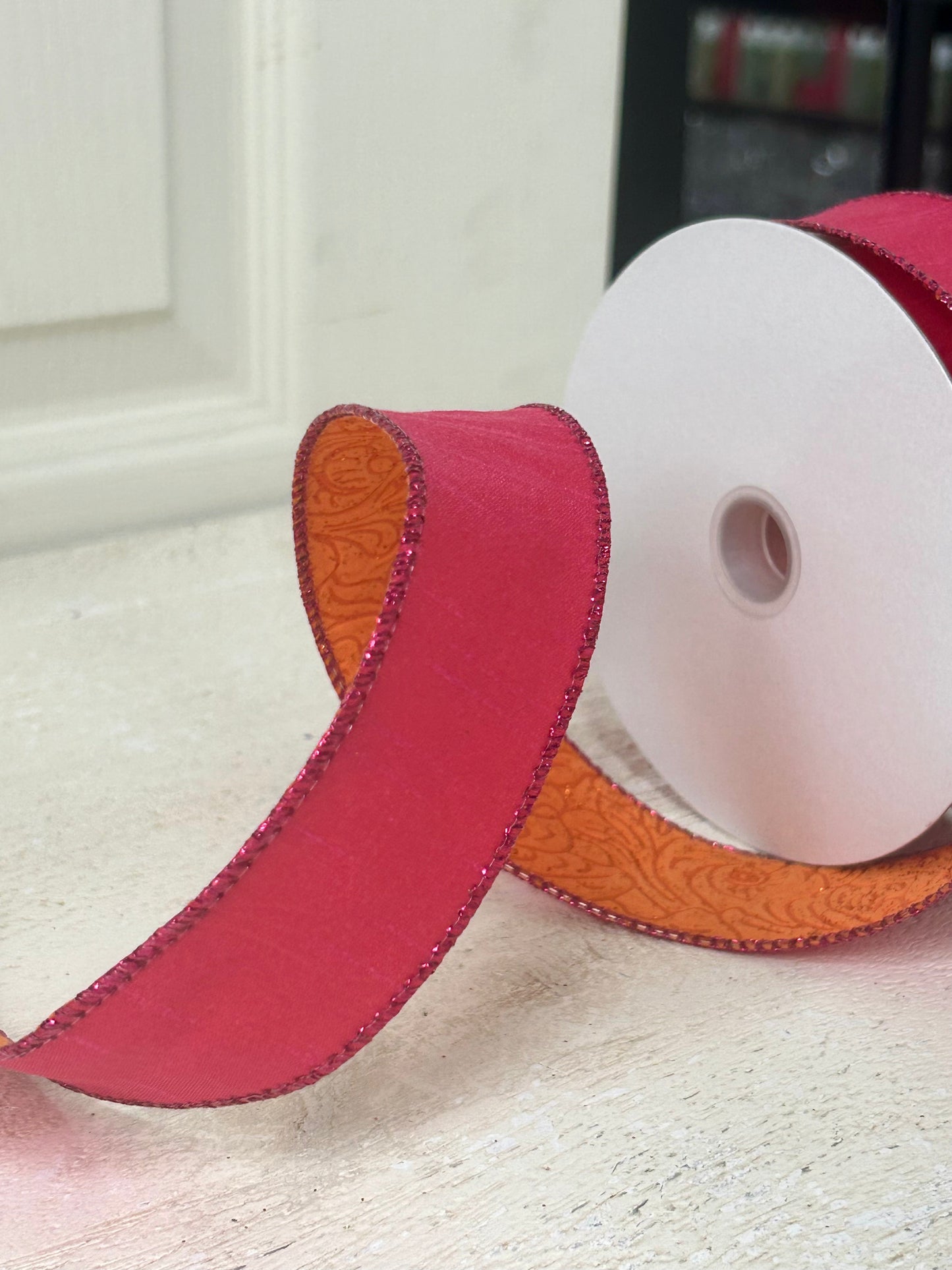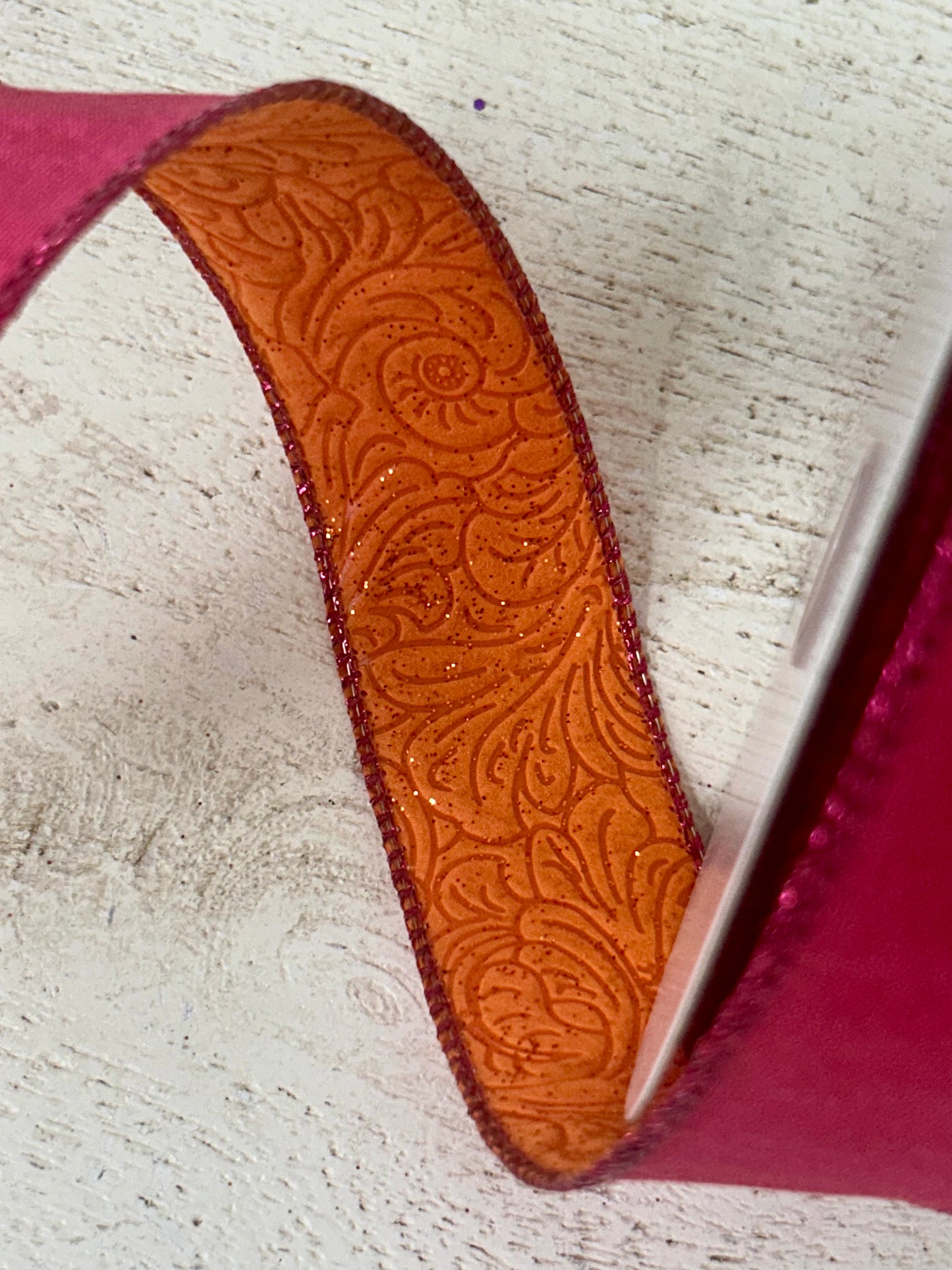 1.5 Inch By 10 Yard Double Sided Fuchsia Dupioni And Orange Glitter Embossed Ribbon