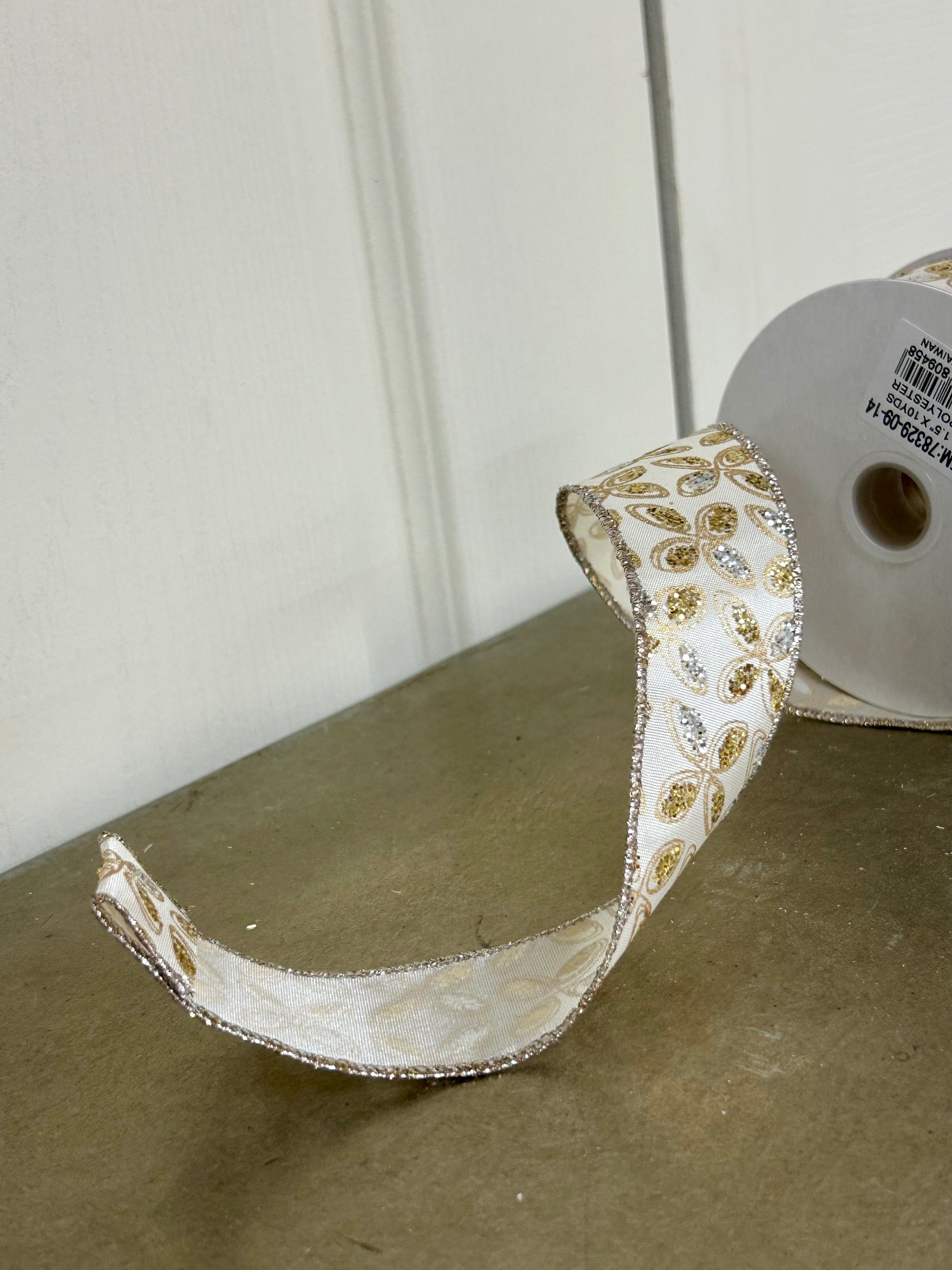 Elevate your holiday décor with this 1.5-inch by 10-yard ribbon featuring shimmering silver and gold glitter petals on an elegant ivory background. Perfect for wreaths, gift wrapping, and festive arrangements, its subtle sparkle adds refined sophistication to any Christmas project. The quality material ensures durable, flexible styling for professional-looking results every time.