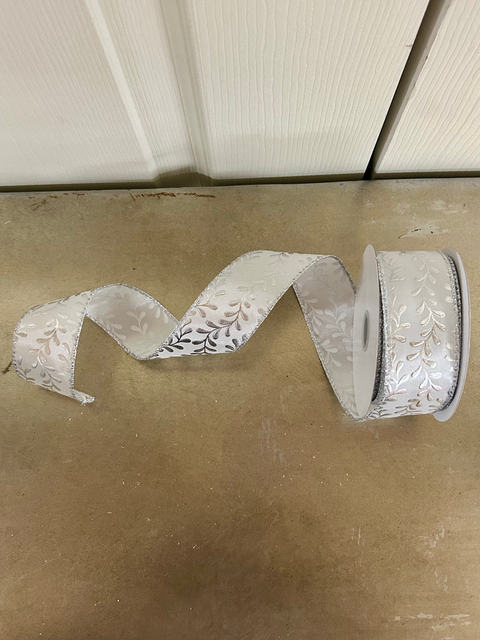 1.5 Inch By 10 Yard White And Silver Embossed Vines Ribbon