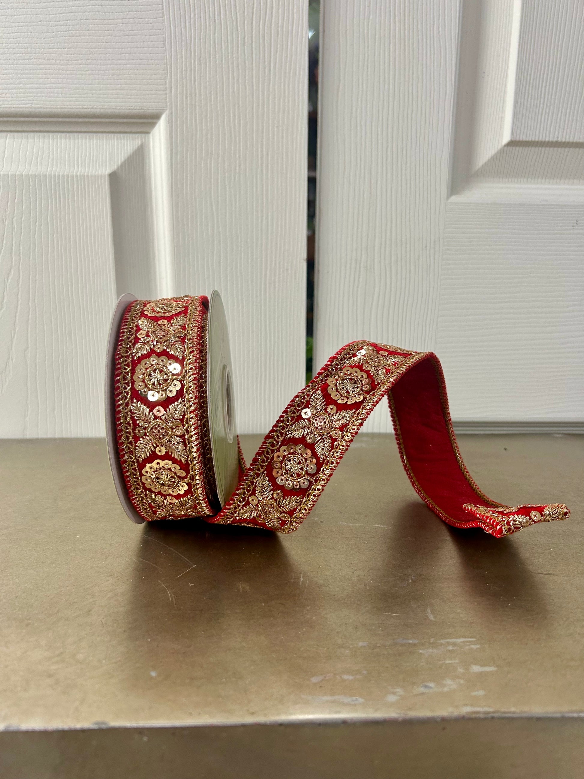 1.5 Inch By 5 Yard Red And Gold Jewel Trim Velvet Ribbon
