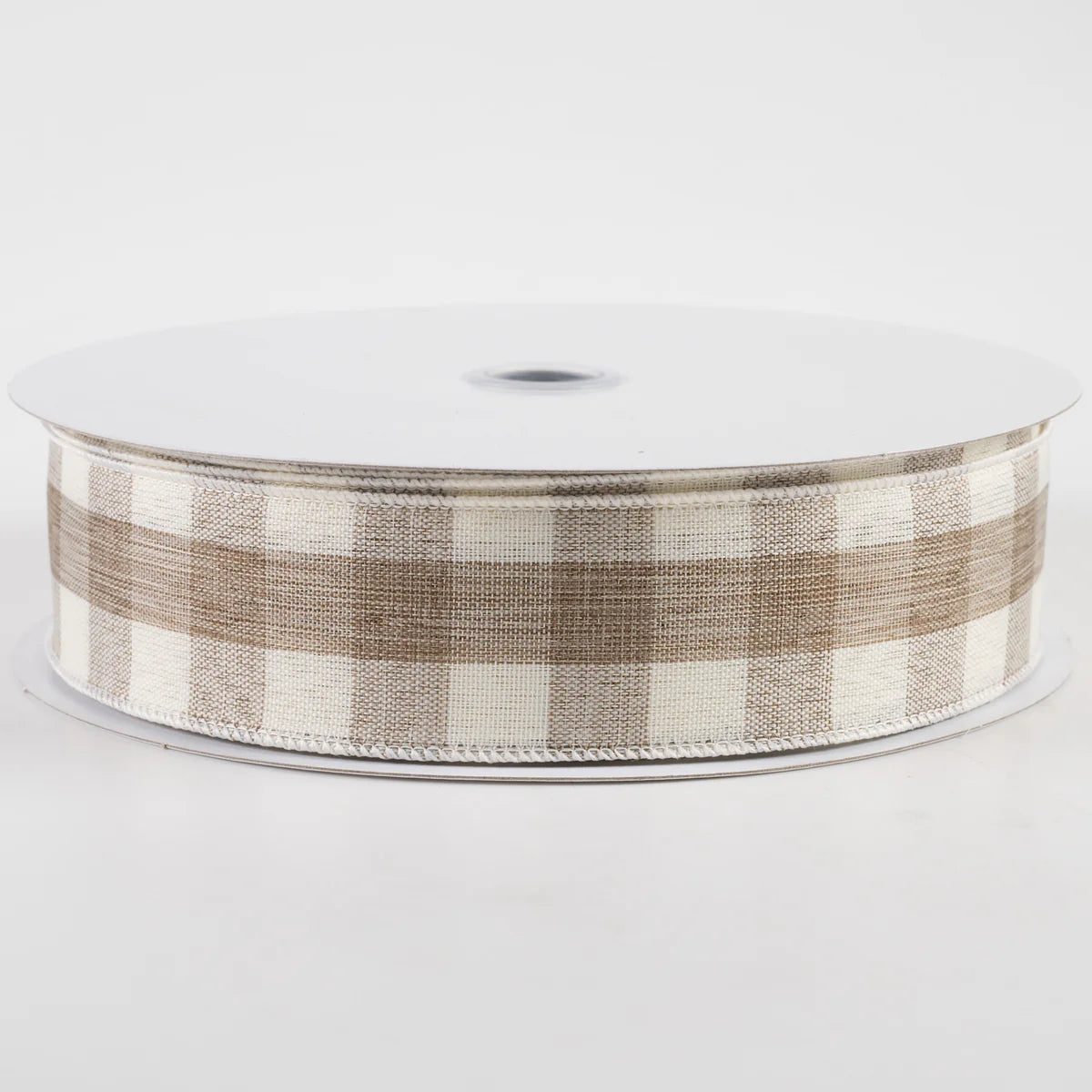 - Cream and light brown threads are woven into a large check pattern for a neutral-colored canvas ribbon that works in any season.