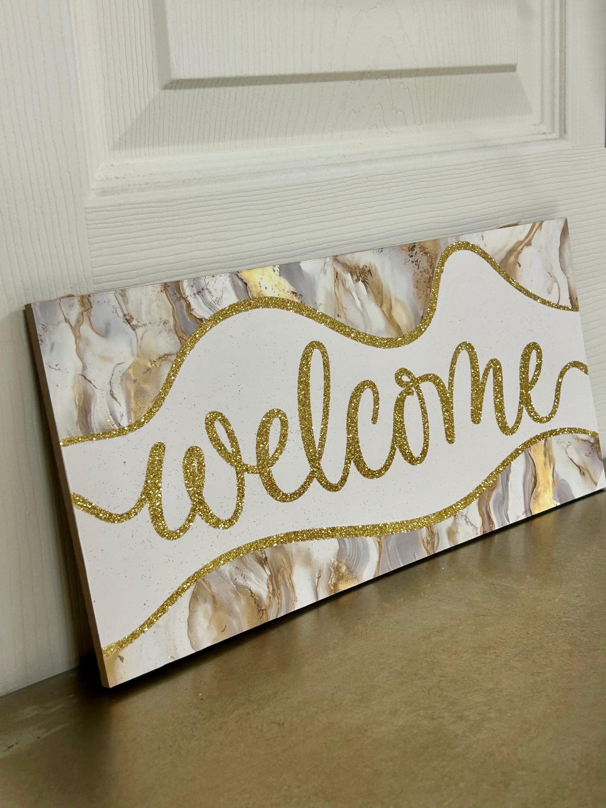 12.5 Inch Glitter Welcome Marble Wood Sign
