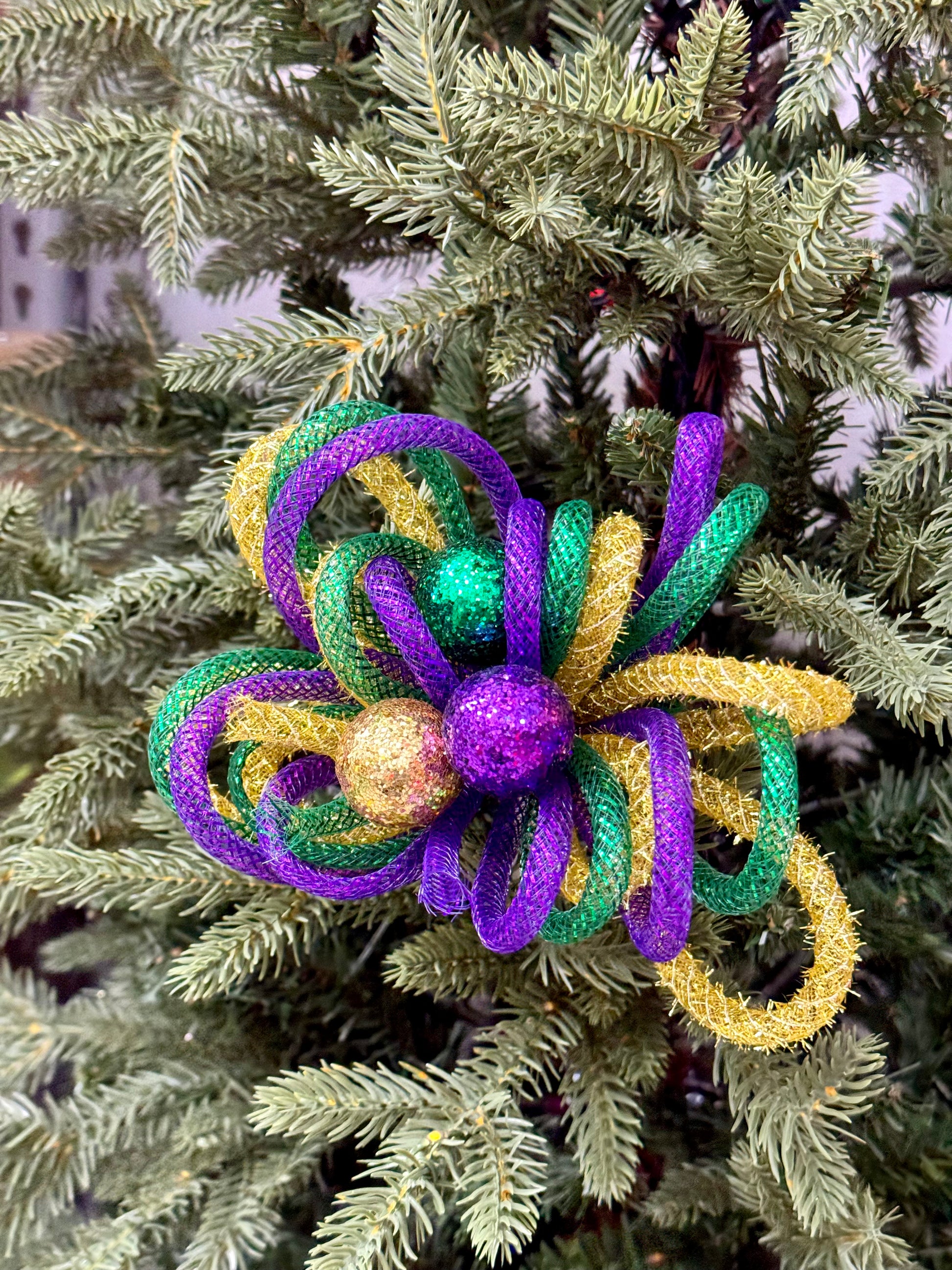 - Outfit your creative display with this marvelous foil/tinsel glitter ball pick! This pick features three glitter balls in the center, surrounded by foil/tinsel tubing. As this pick features Mardi Gras colors, it will be an exciting addition to any holiday display you see fit!