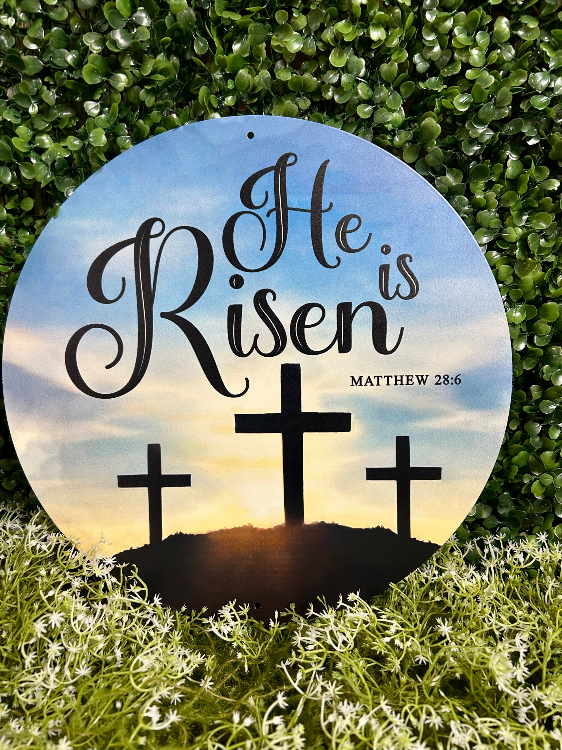 - Share A Message Of Faith This Easter With The "He Is Risen" Metal Sign. This Circular Sign Measures 12 Inches In Diameter And Features The Phrase "He Is Risen" In A Elegant Script, Surrounded By A Delicate Arrangement Of Crosses And Florals. It Is Made Of Sturdy Metal And Is A Perfect Addition To A Gallery Wall, Door, Or Entryway. This Sign Is A Beautiful And Inspiring Way To Celebrate The True Meaning Of The Season.