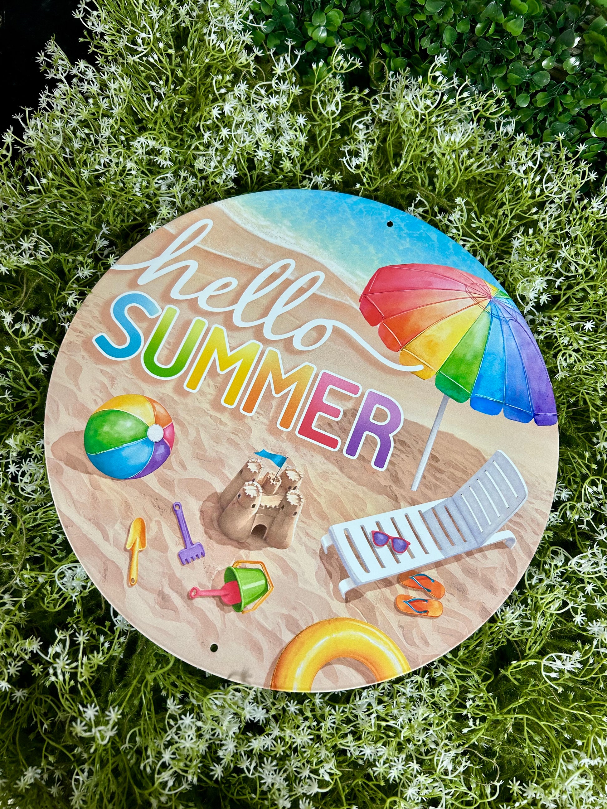 - This Delightful 12" Dia Metal "Hello Summer" With Beach Sign Is The Perfect Accent To Welcome The Sunny Season! Crafted From Durable Metal, It Features A Charming Design With A Beach Theme. It Comes With Convenient Top And Bottom Holes For Easy Hanging And Display, Making It Ideal For Doors, Walls, Or Fences.