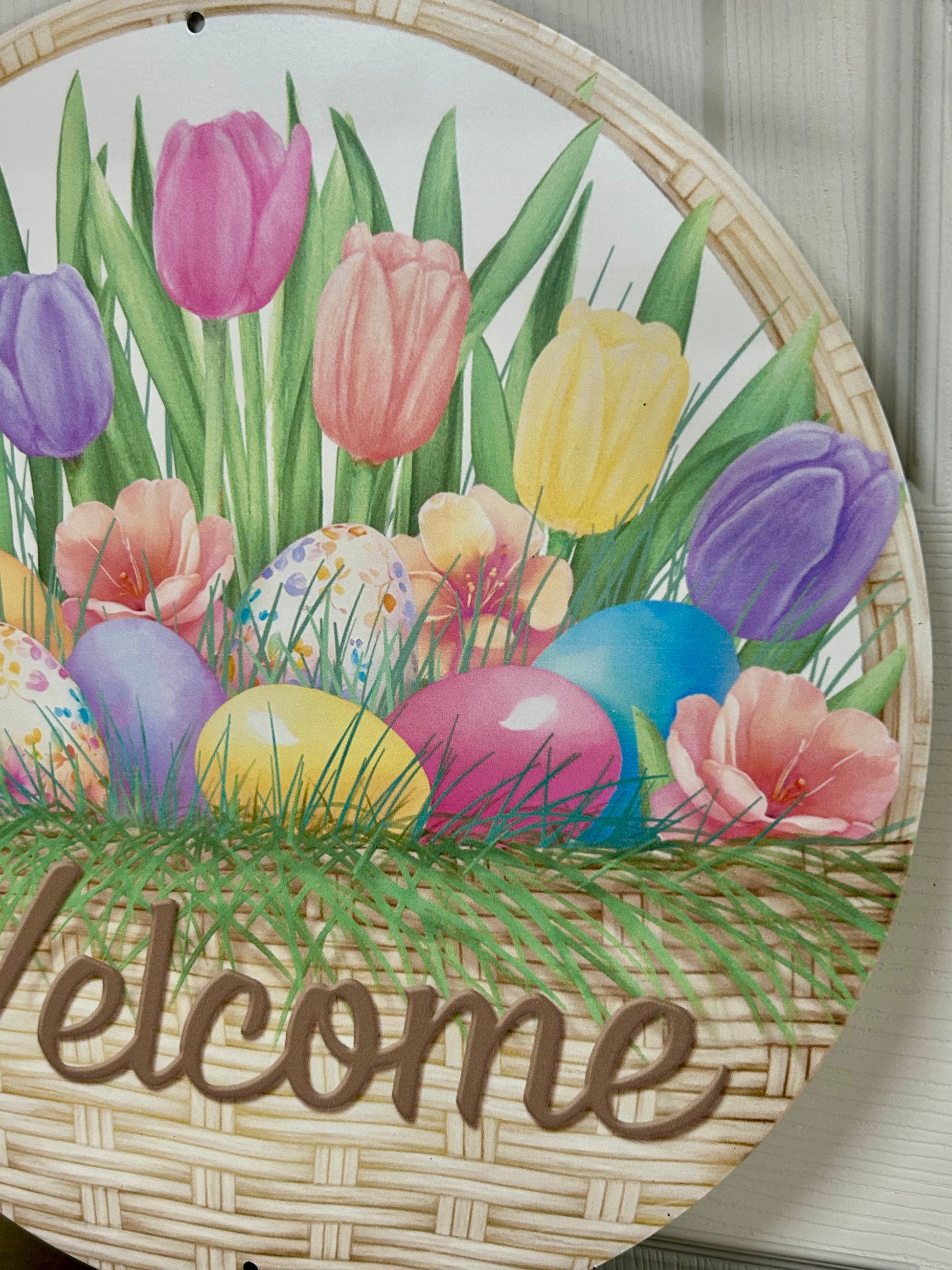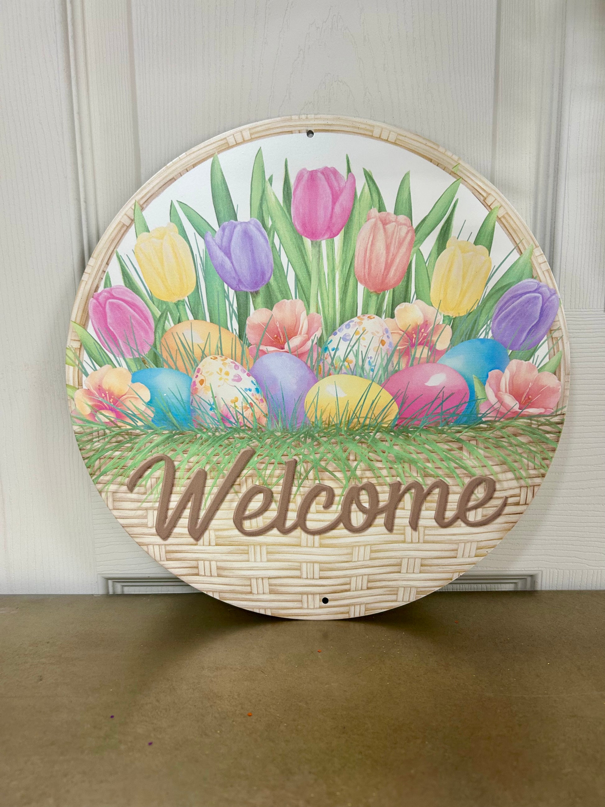 Brighten Up Your Home With This Delightful 12" Dia Metal Welcome Basket Sign, Perfect For Spring And Beyond. Crafted From Durable Metal, This Round Sign Showcases A Charming Design Of A Welcome Basket Brimming With Colorful Eggs And Blossoming Flowers. With Convenient Pre-Drilled Holes At Both The Top And Bottom, It's Easy To Mount Securely, Making It An Ideal Accent For Your Front Door, Patio, Or Even An Indoor Farmhouse-Themed Display.