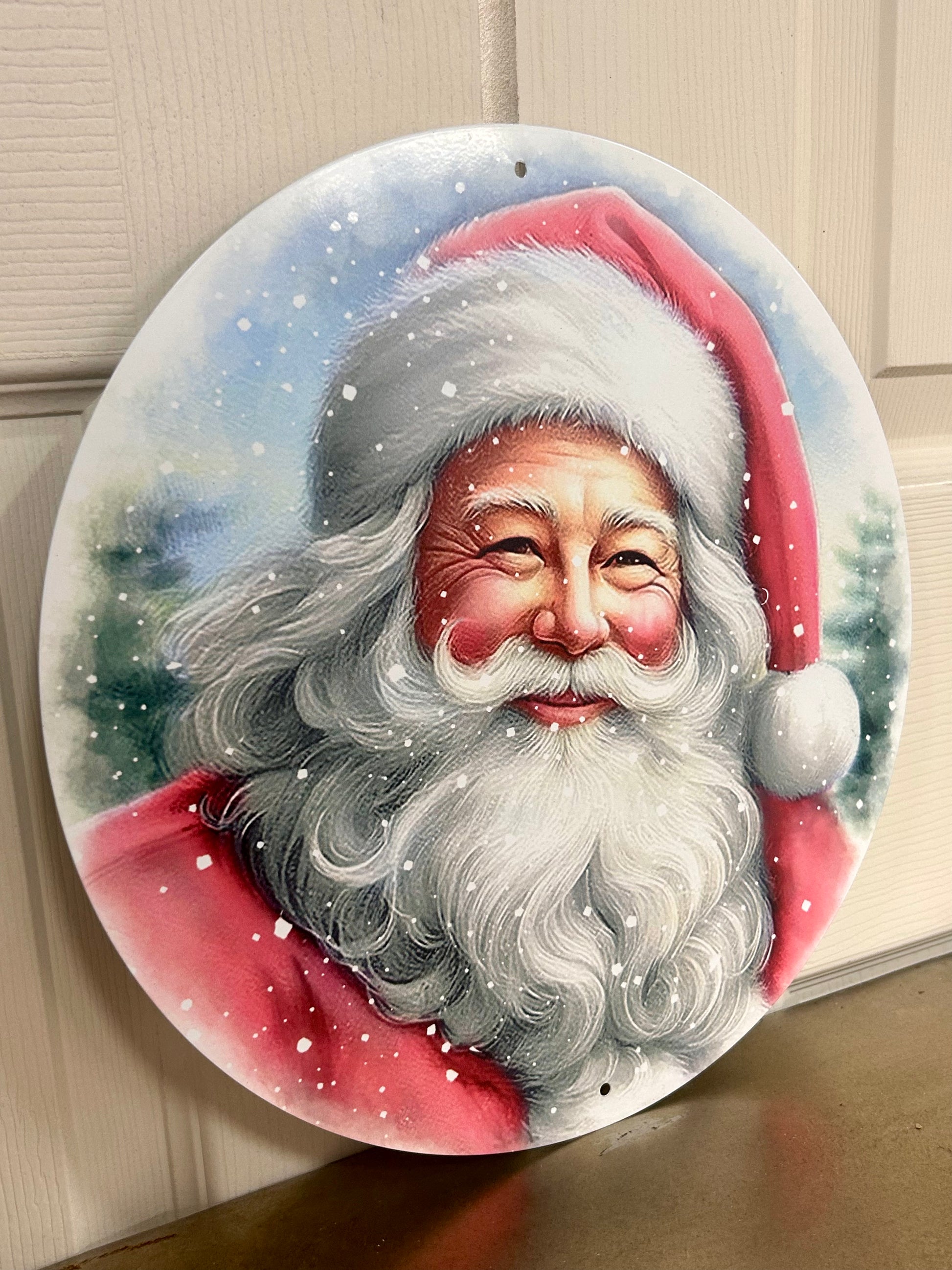 - This round metal sign features a jolly Santa Claus portrait rendered in soft watercolor-style artwork within a snowy winter scene. Santa's rosy cheeks and warm smile are framed by his fluffy white beard and pink hat with white trim, while gentle snowflakes drift around him against a pale blue background. The 12-inch diameter makes this sign perfect for incorporating into Christmas wreaths or displaying as standalone holiday decor.