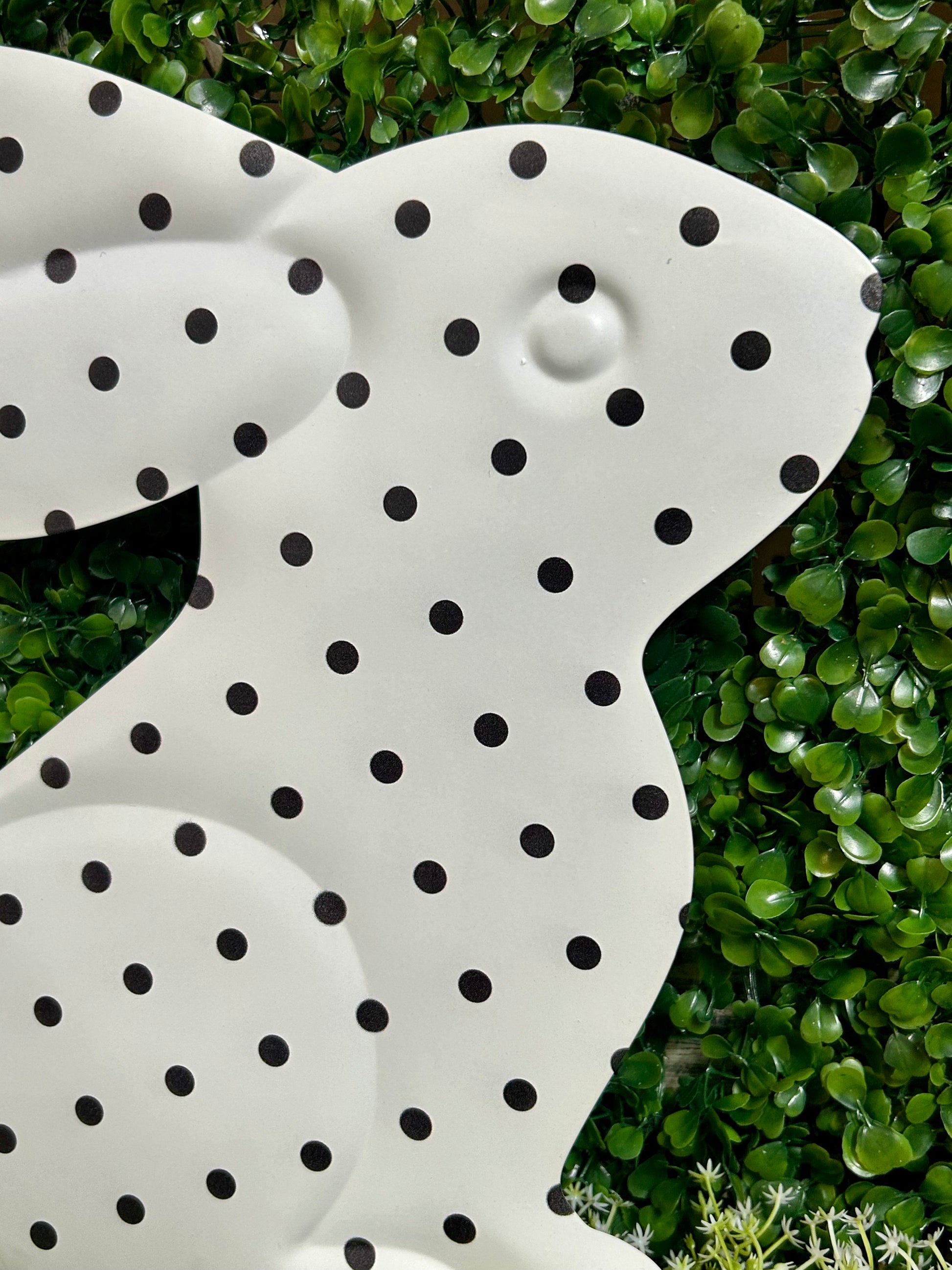 - Hop Right Into Decorating When You Use This Charming Metal Sitting Bunny! This Cottontail Bunny Is Colored In White And Features Black Polka Dots Throughout, Allowing Him To Fit In Perfectly With Easter And Spring Decor Alike! Hang This Bunny On The Wall, Or Use Him In A Wreath To Really Leap To New Decorative Heights!