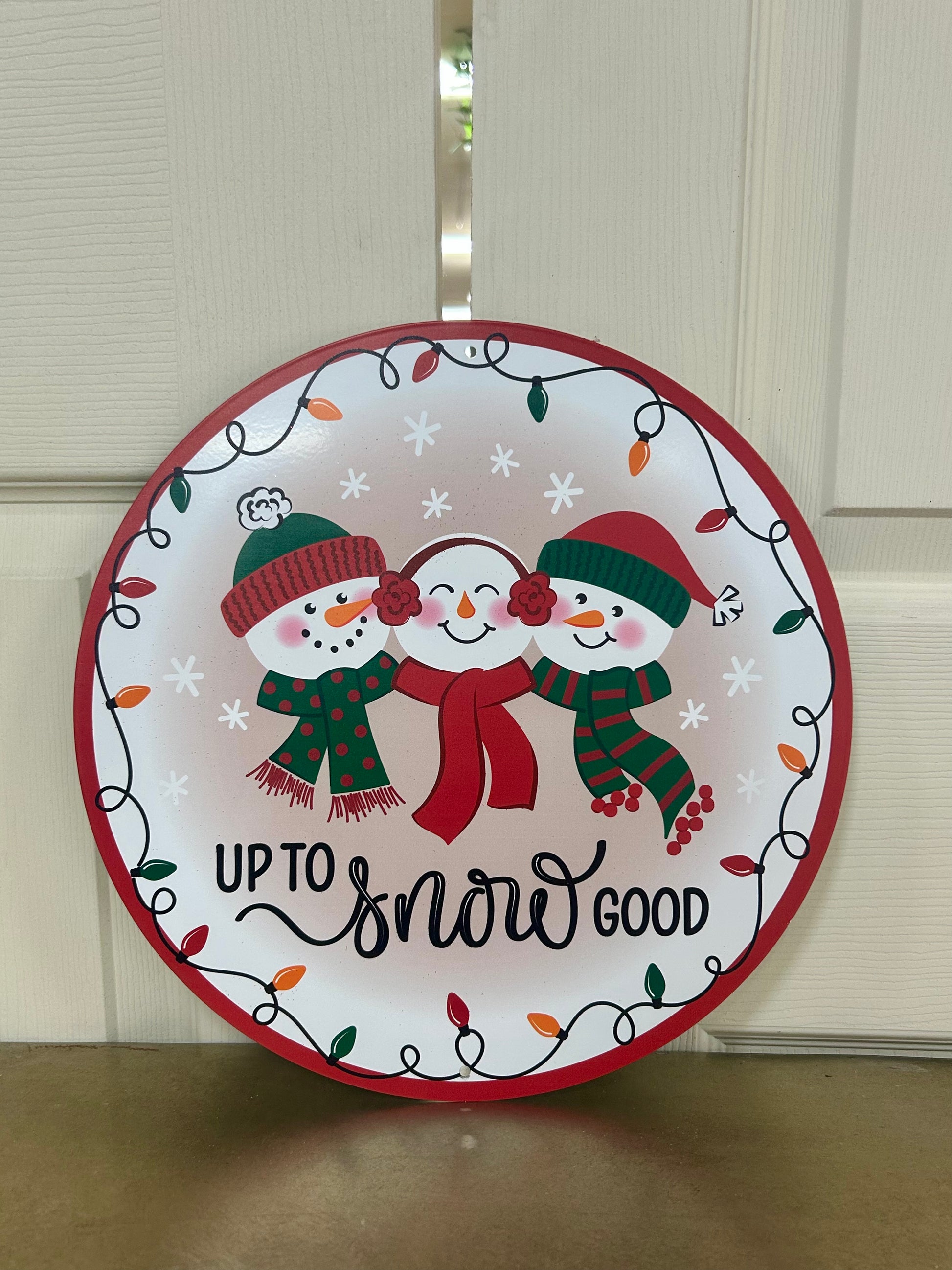 Celebrate the season with this charming 12-inch metal sign featuring the playful phrase "Up To Snow Good." Crafted from durable metal with a weather-resistant finish, this festive decoration brings holiday cheer to any space—indoors or out. The bold, easy-to-read lettering makes it an ideal accent for entryways, patios, or seasonal displays. Perfect for spreading winter joy and adding a touch of humor to your Christmas décor. A versatile gift for anyone who appreciates clever holiday touches.