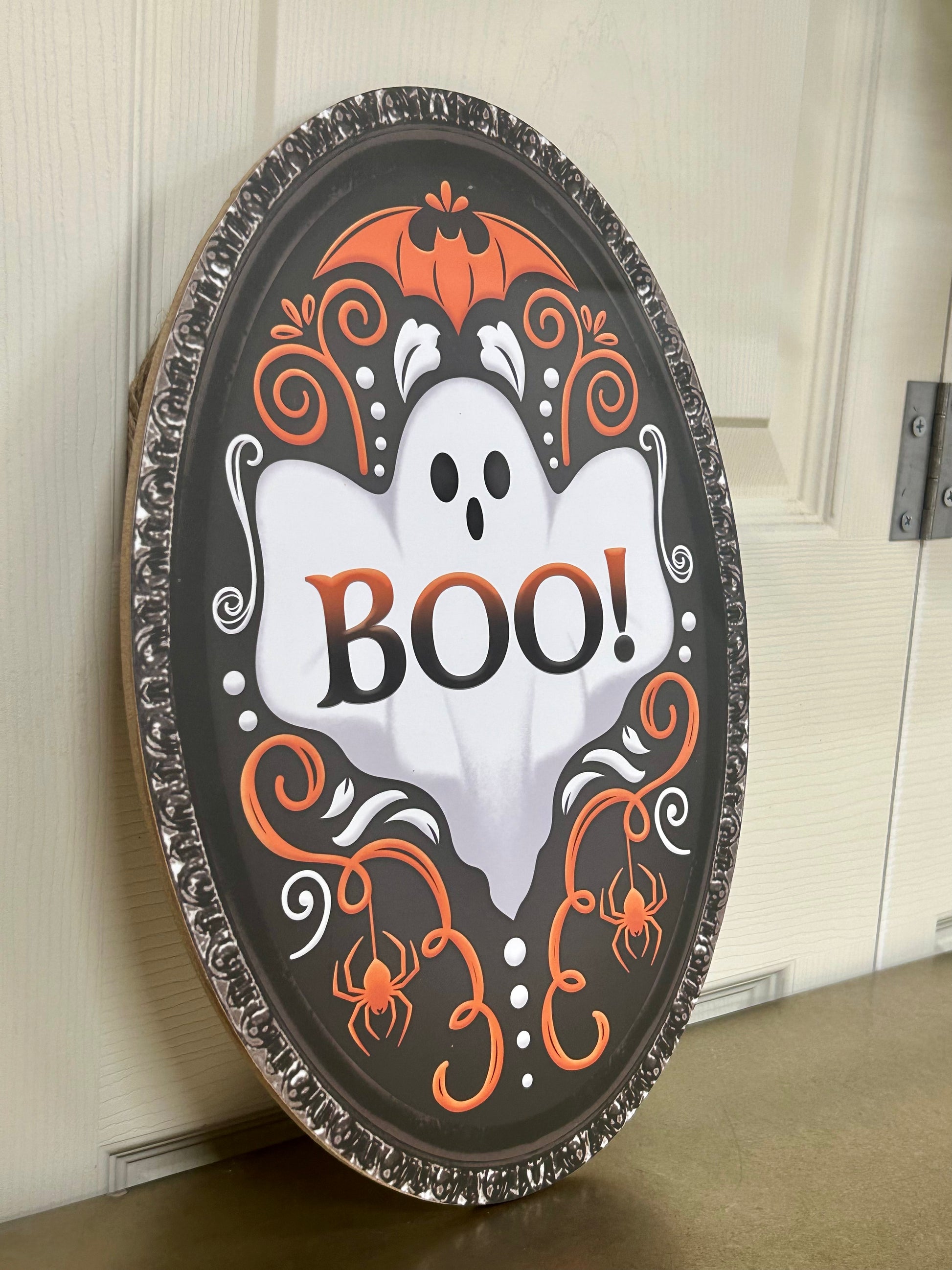 Add a charming touch to your Halloween decor with this 13-inch oval wood sign featuring a friendly ghost and the word "BOO." Crafted from durable wood, it offers a rustic yet festive accent perfect for doorways, walls, or mantels. Its compact size makes it versatile for any space, enhancing your seasonal display with a tasteful, expert-designed appeal.