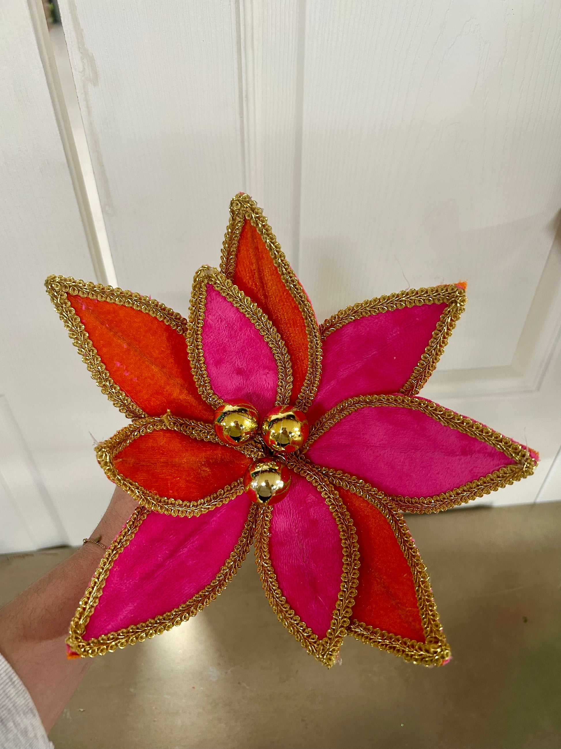 14 Inch Hot Pink Orange And Gold Velvet Poinsettia Pick With Lace Edge