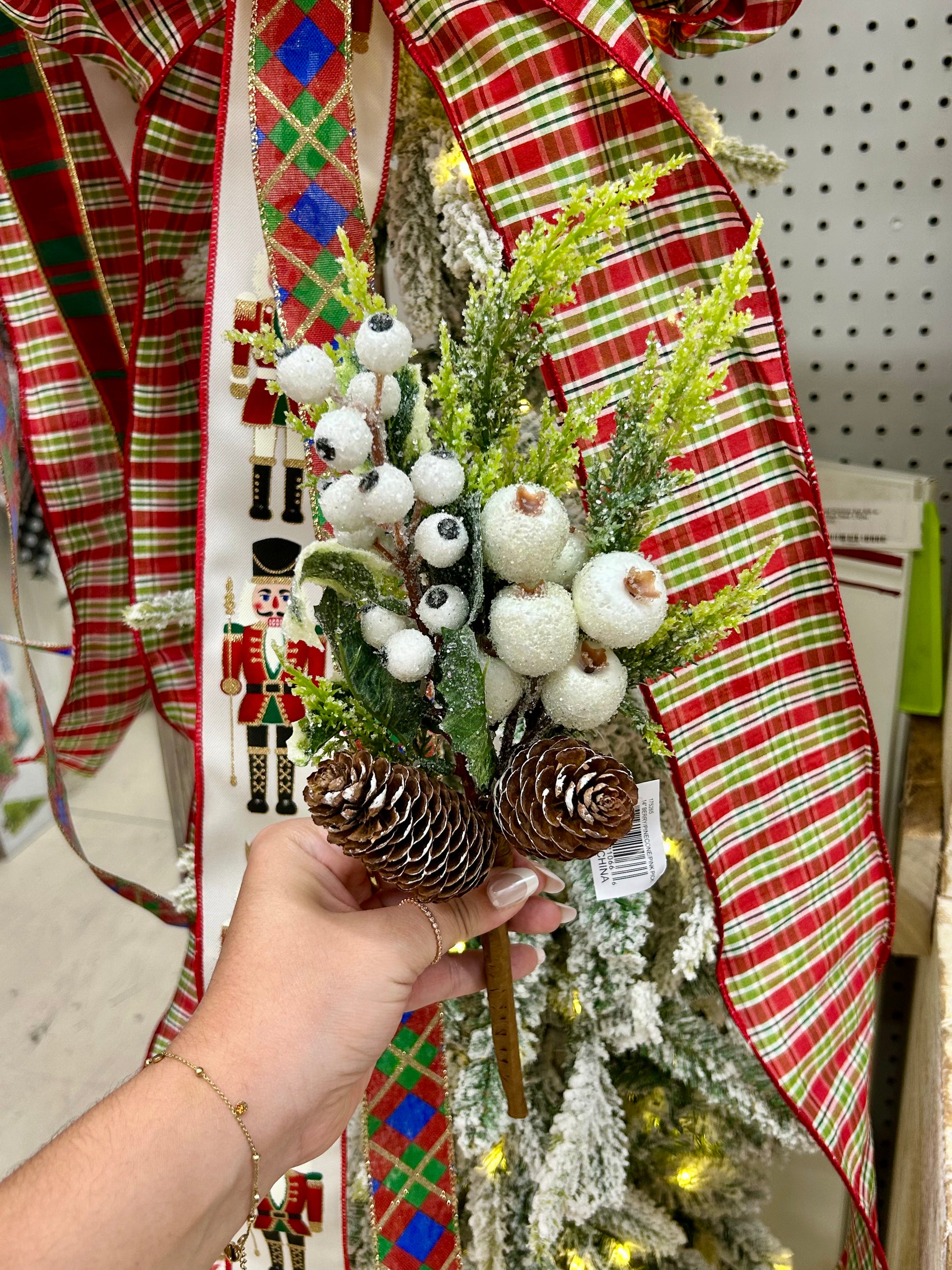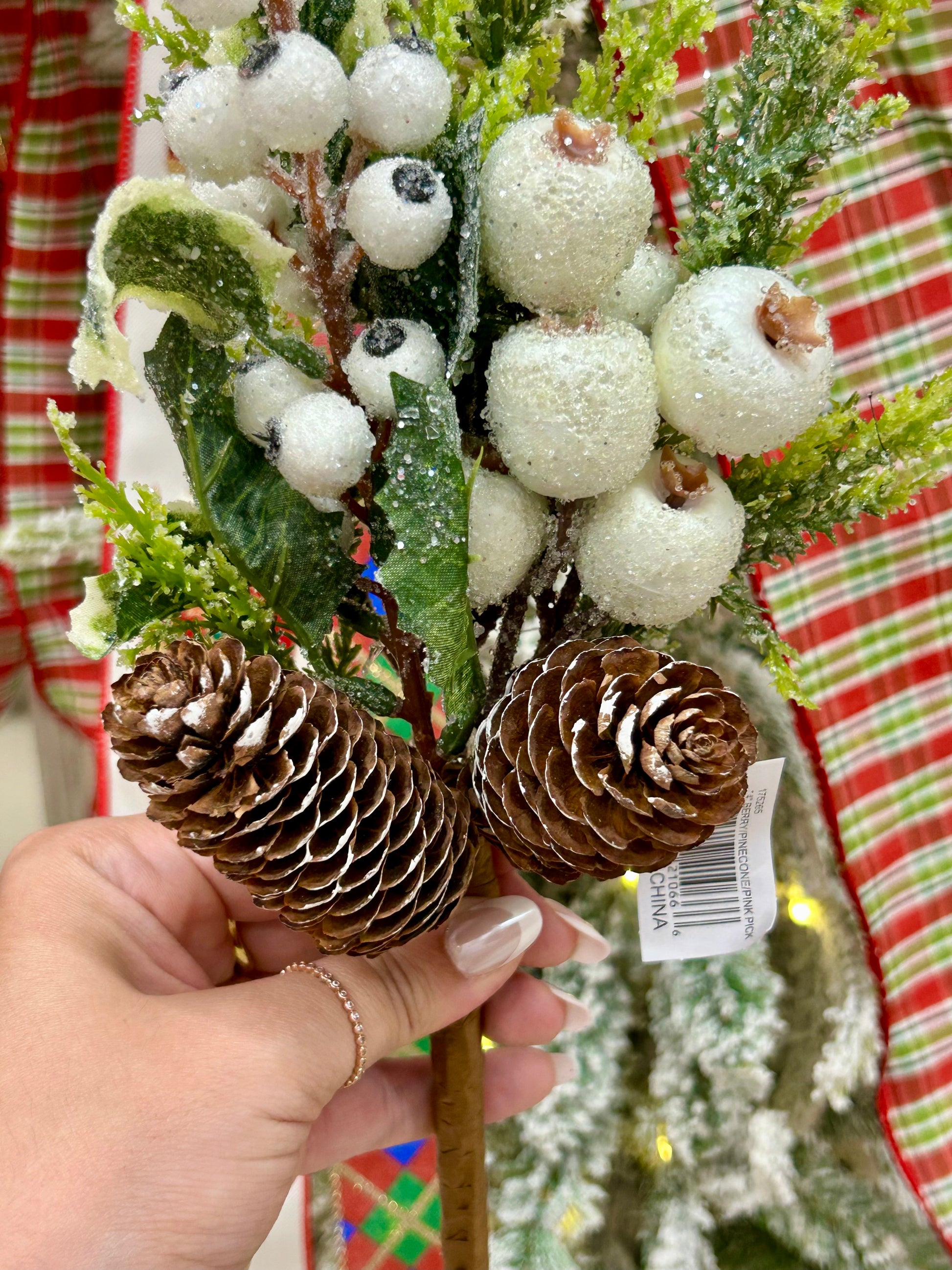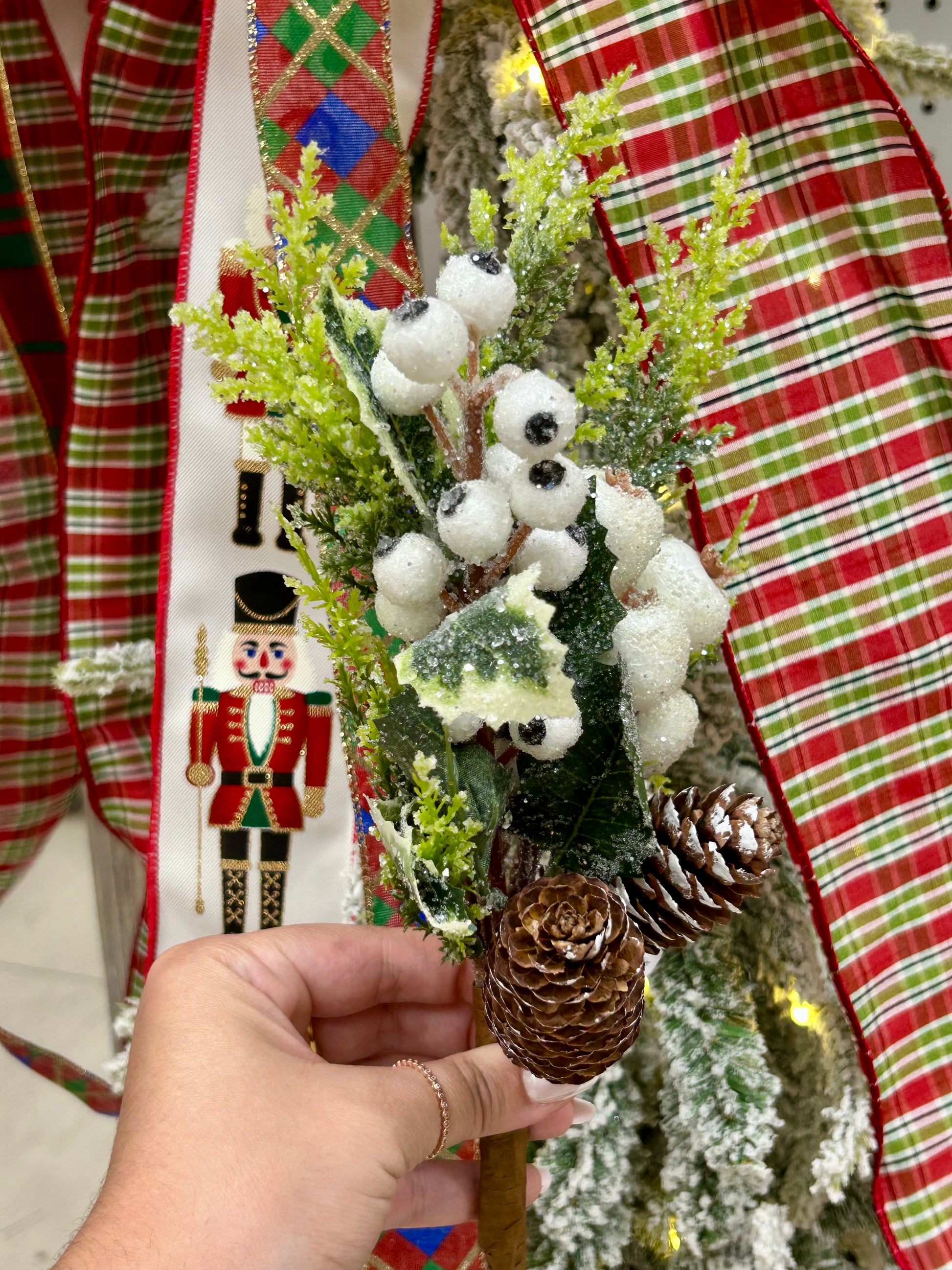 Elevate your holiday decor with this 14-inch White Berry Pinecone Pick. Featuring delicate white berries and pinecones dusted with glittering snowy details, it adds a crisp, wintry touch to wreaths, centerpieces, and floral arrangements. Expertly crafted, this pick brings a realistic and festive charm to your Christmas decorations, enhancing seasonal displays with understated elegance.