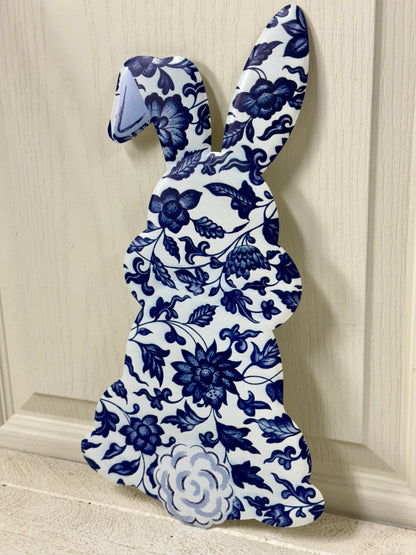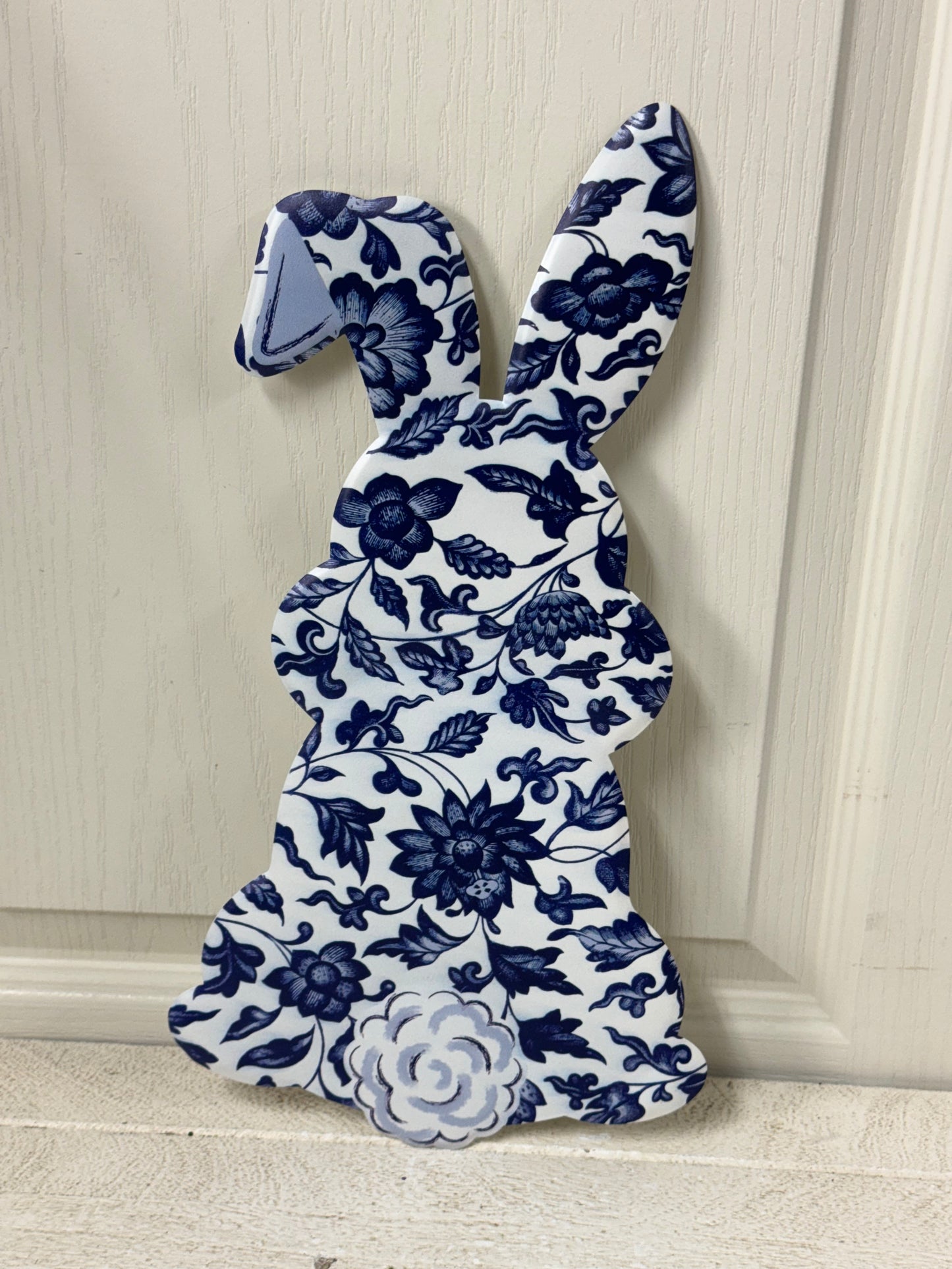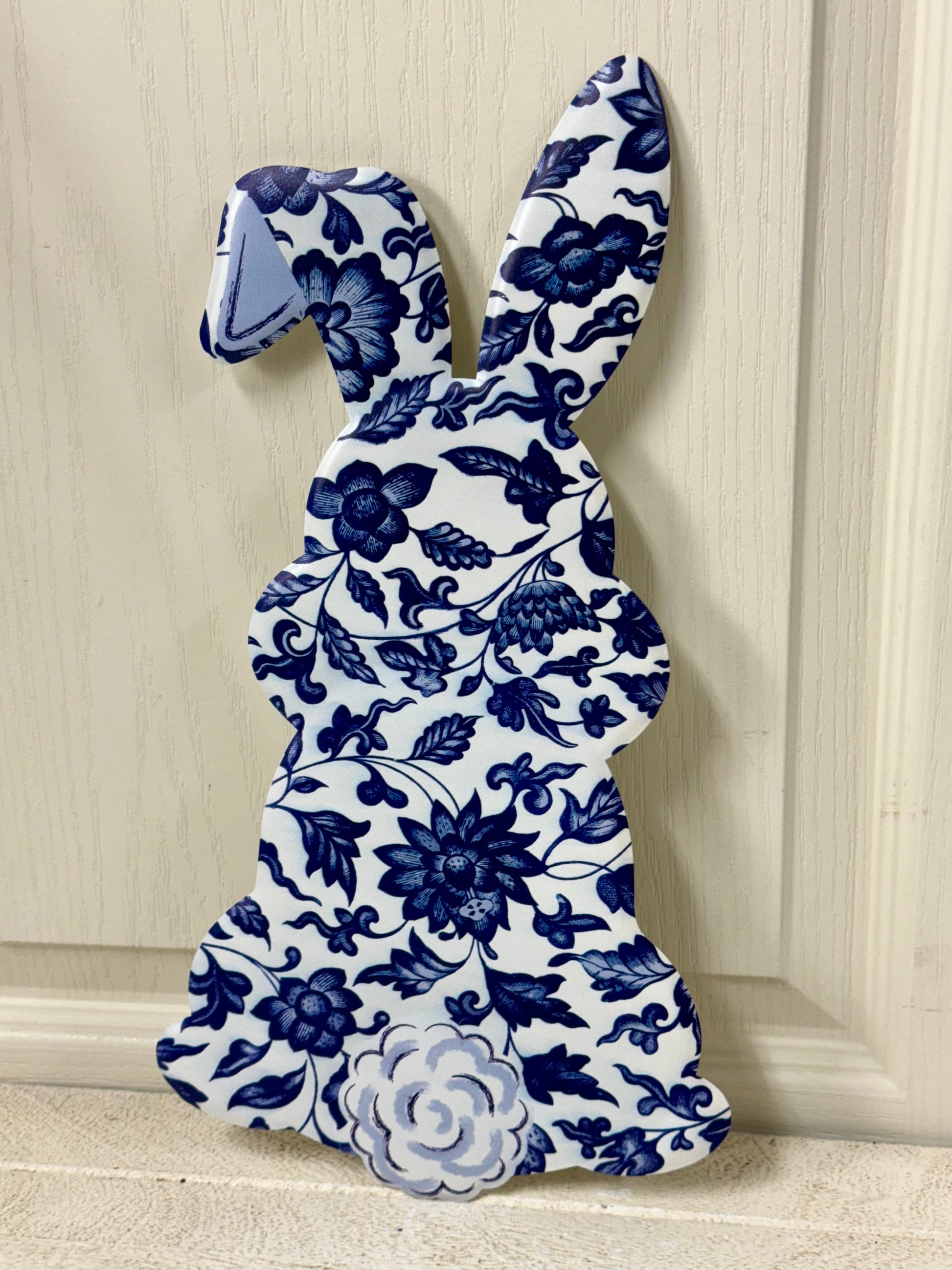 15 Inch Blue And White Chinoiserie Bunny Metal Bottom Sign