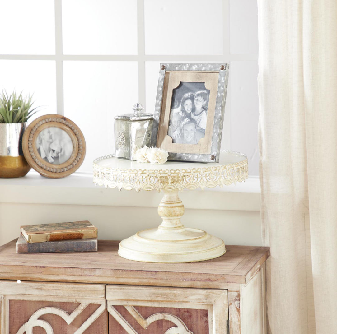 - A great storage unit to display your decor and memorabilia in a compact friendly setting. A versatile piece for displaying jewelry, trinkets, candles, plants or small décor in your kitchen or living room. Place the cream cake plate in your dining area or kitchen to display photo frames or decorative jars to add height and visual interest. Designed with felt or rubber stoppers at the base that prevent scratching furniture and table tops, as well as sliding around. Suitable for indoor use only. This is a single cream colored cake plate. Farmhouse style.