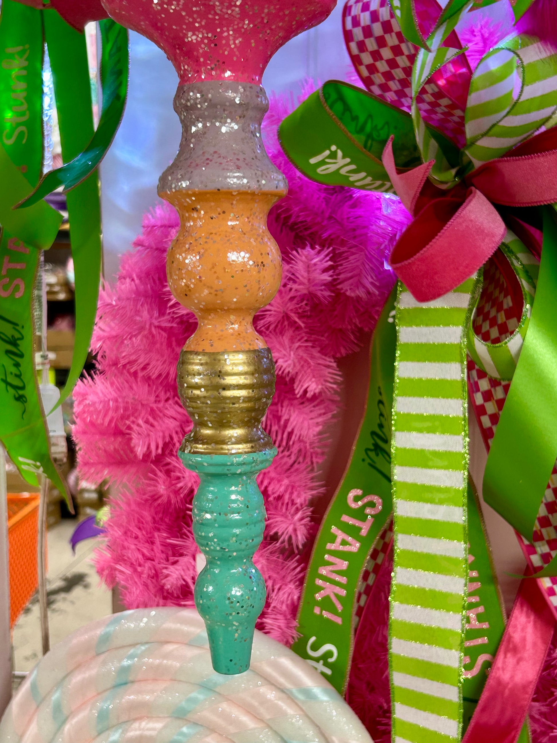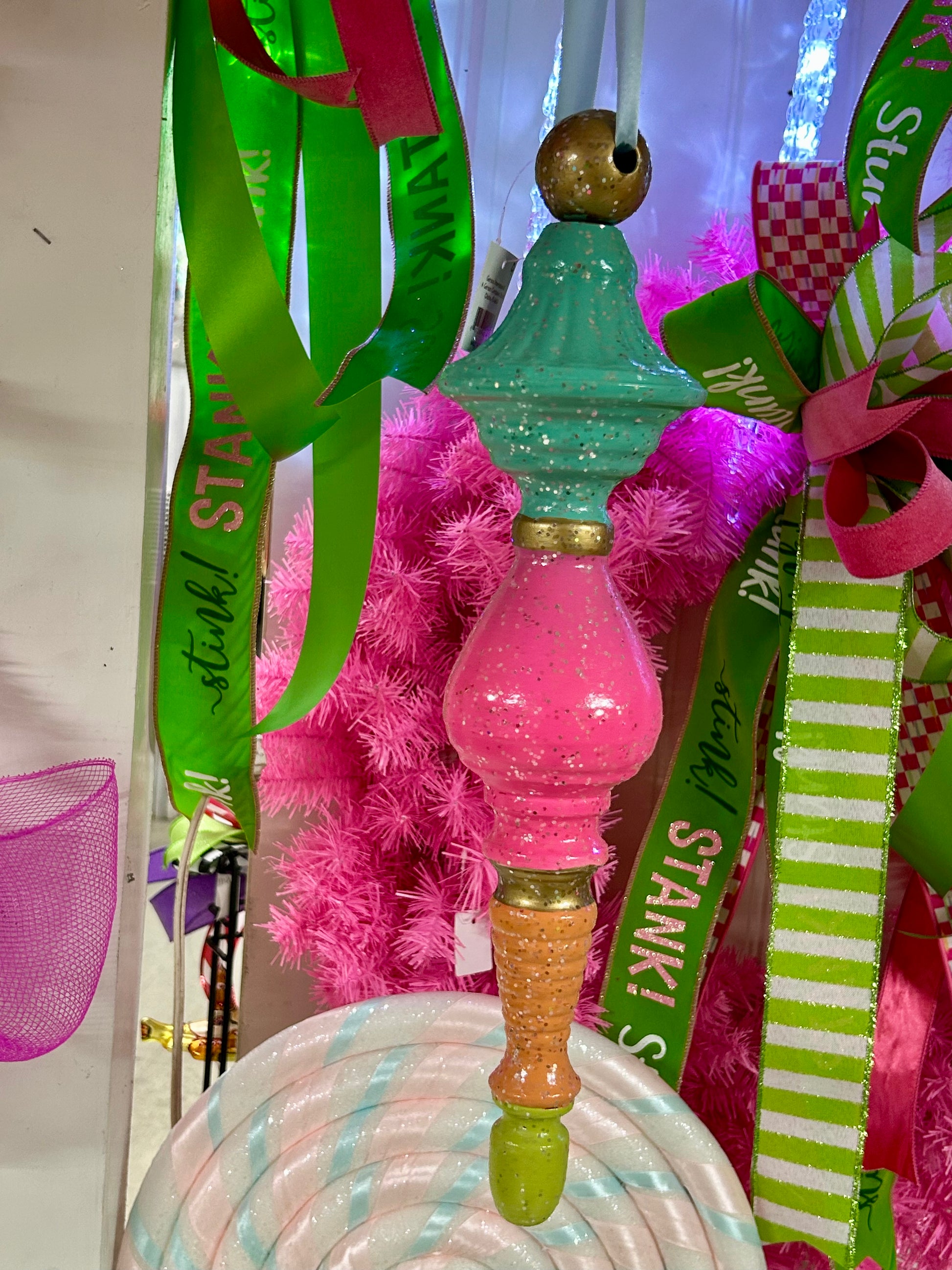 Elevate your holiday décor with this 17-inch metal Holiday Candy Finial Ornament, available in two vibrant styles. Style one features a teal top with accents of pink, gold, orange, and lime green, while style two presents a pink top combined with purple, orange, gold, and teal hues. Crafted for lasting brightness, each piece offers a striking focal point to enhance festive settings with rich color and elegant design. Perfect for adding a sophisticated yet playful touch to mantels, trees, or holiday displays.