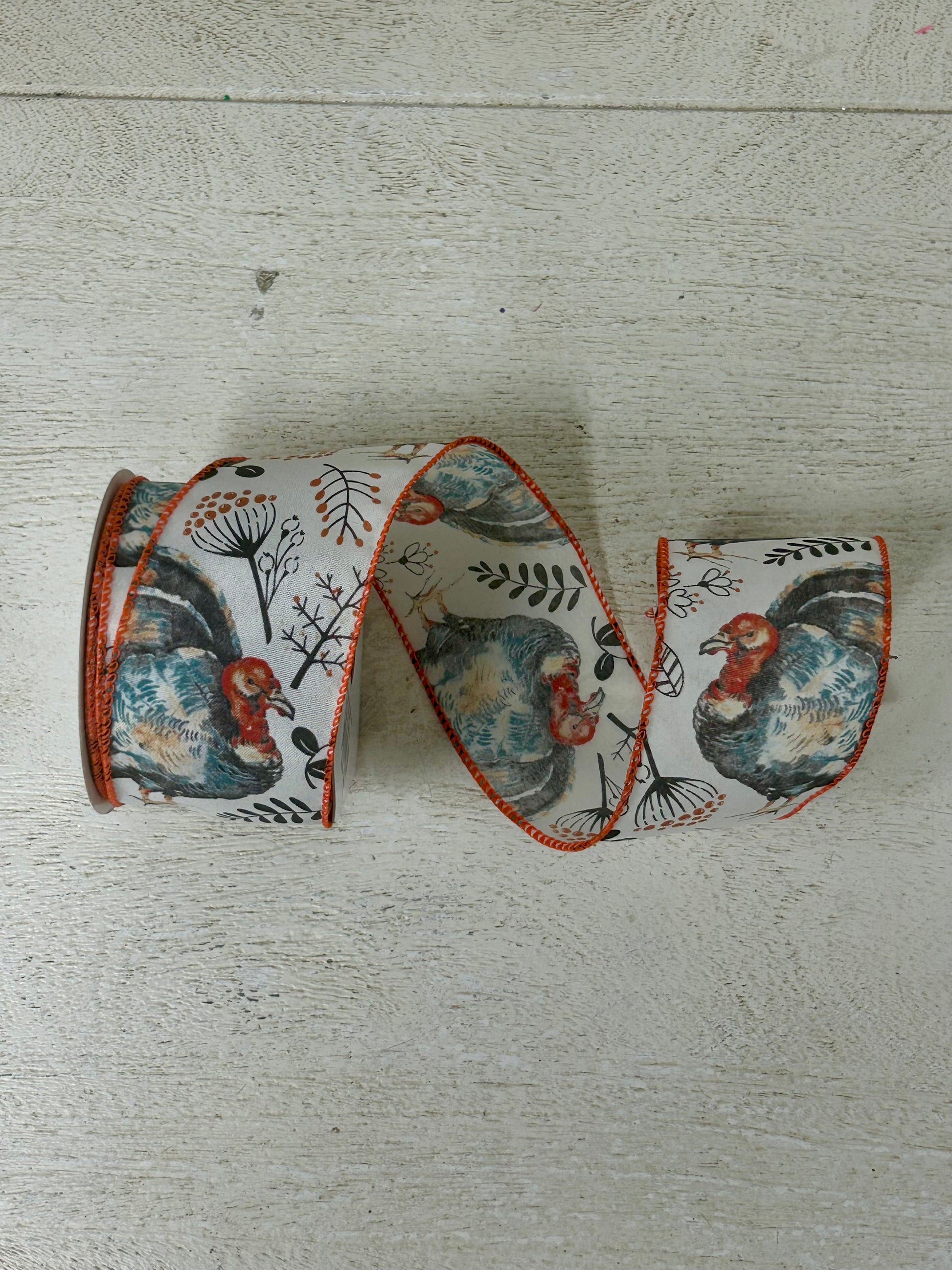This 2.5-inch wide ribbon features a vibrant design with blue and orange turkeys accented by orange berry sprays on a crisp white background. Finished with orange edging, it offers a festive and elegant touch perfect for Thanksgiving decorations, gift wrapping, and seasonal crafts. Its durable fabric ensures lasting quality for all your creative projects.