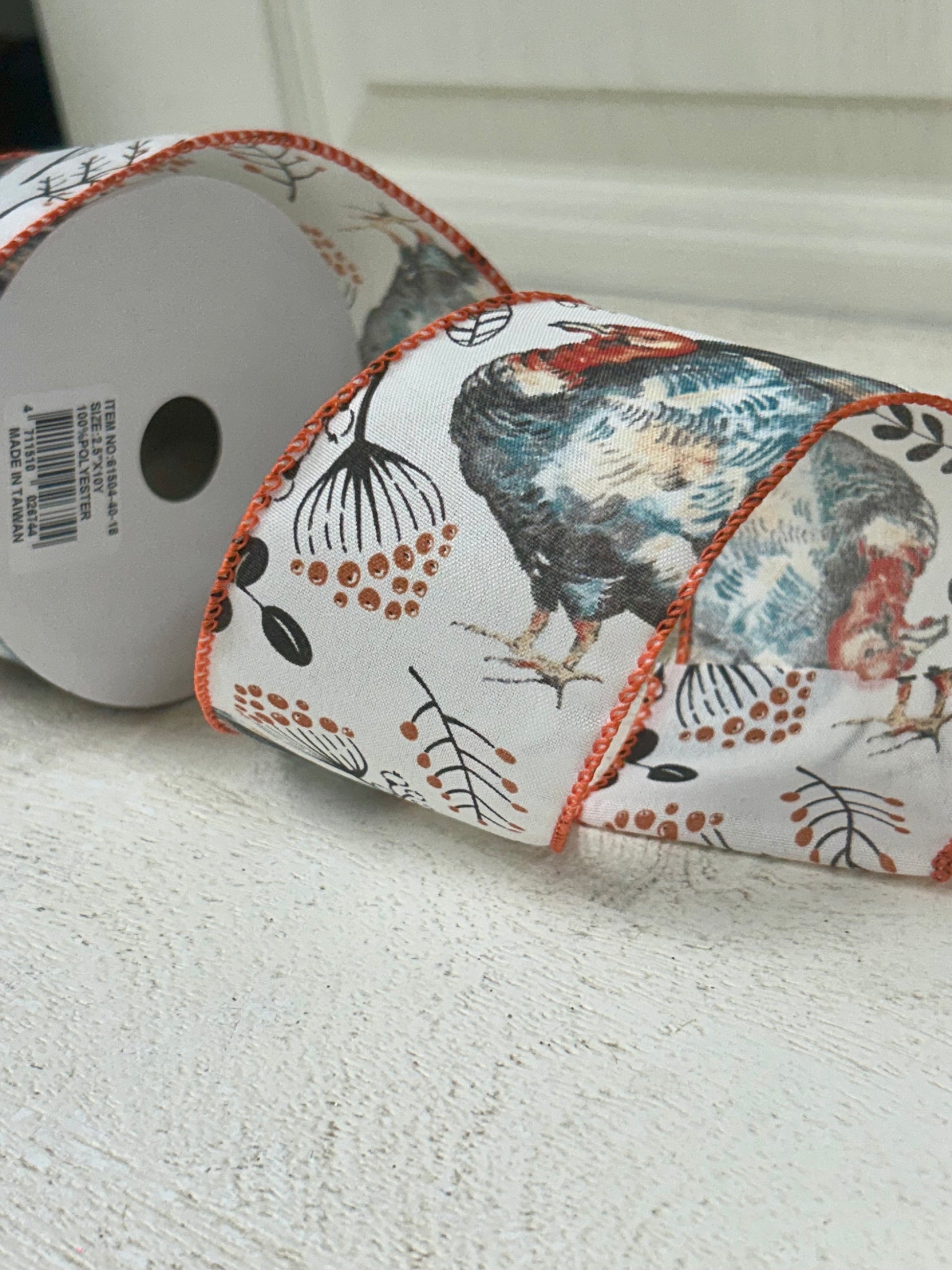 2.5 Inch By 10 Yard Blue And Orange Turkey With Orange Berry Sprays With A White Background And Orange Edging Ribbon