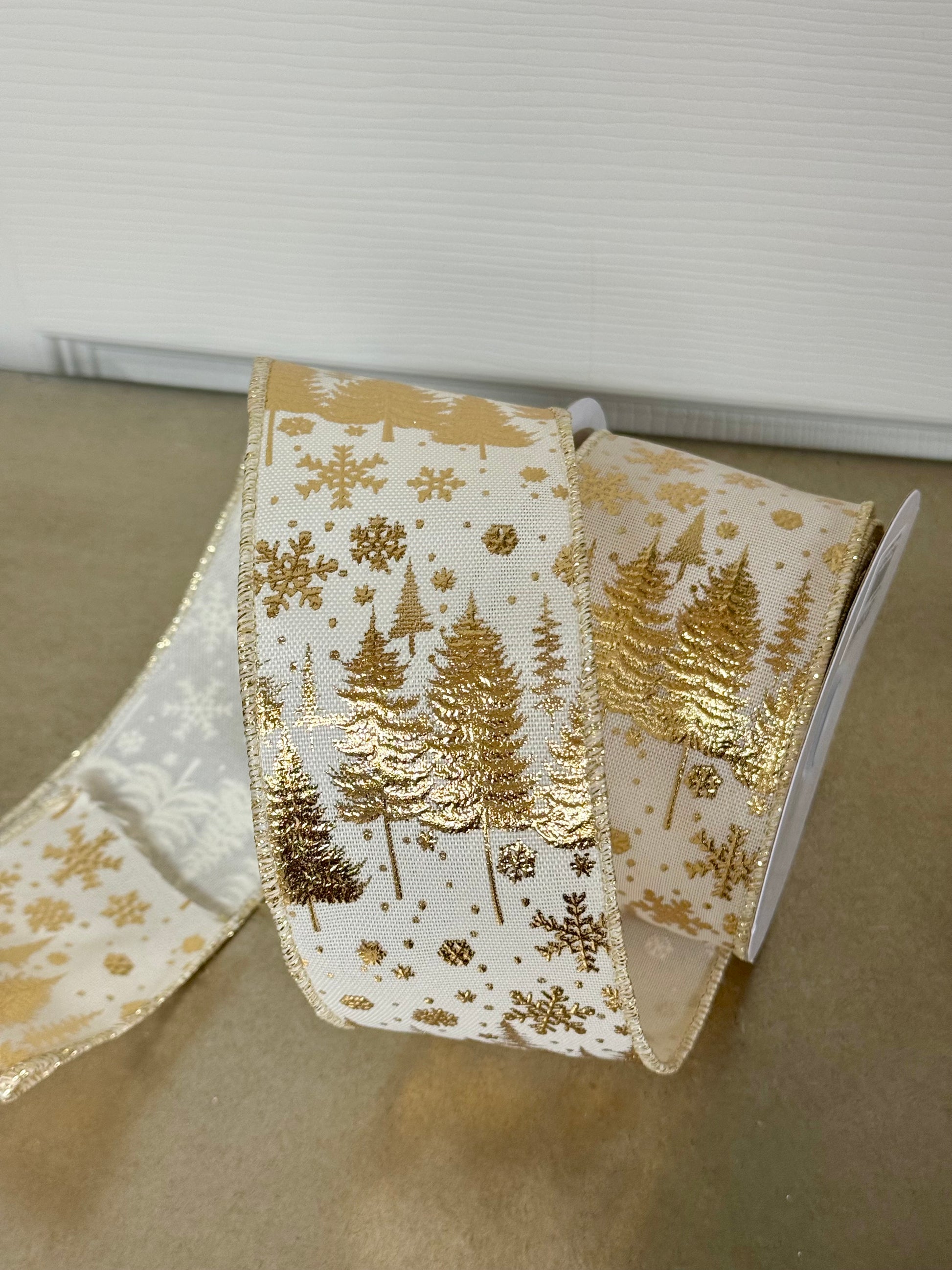2.5 Inch By 10 Yard Dark Cream And Gold Pine Trees And Snowflakes Ribbon