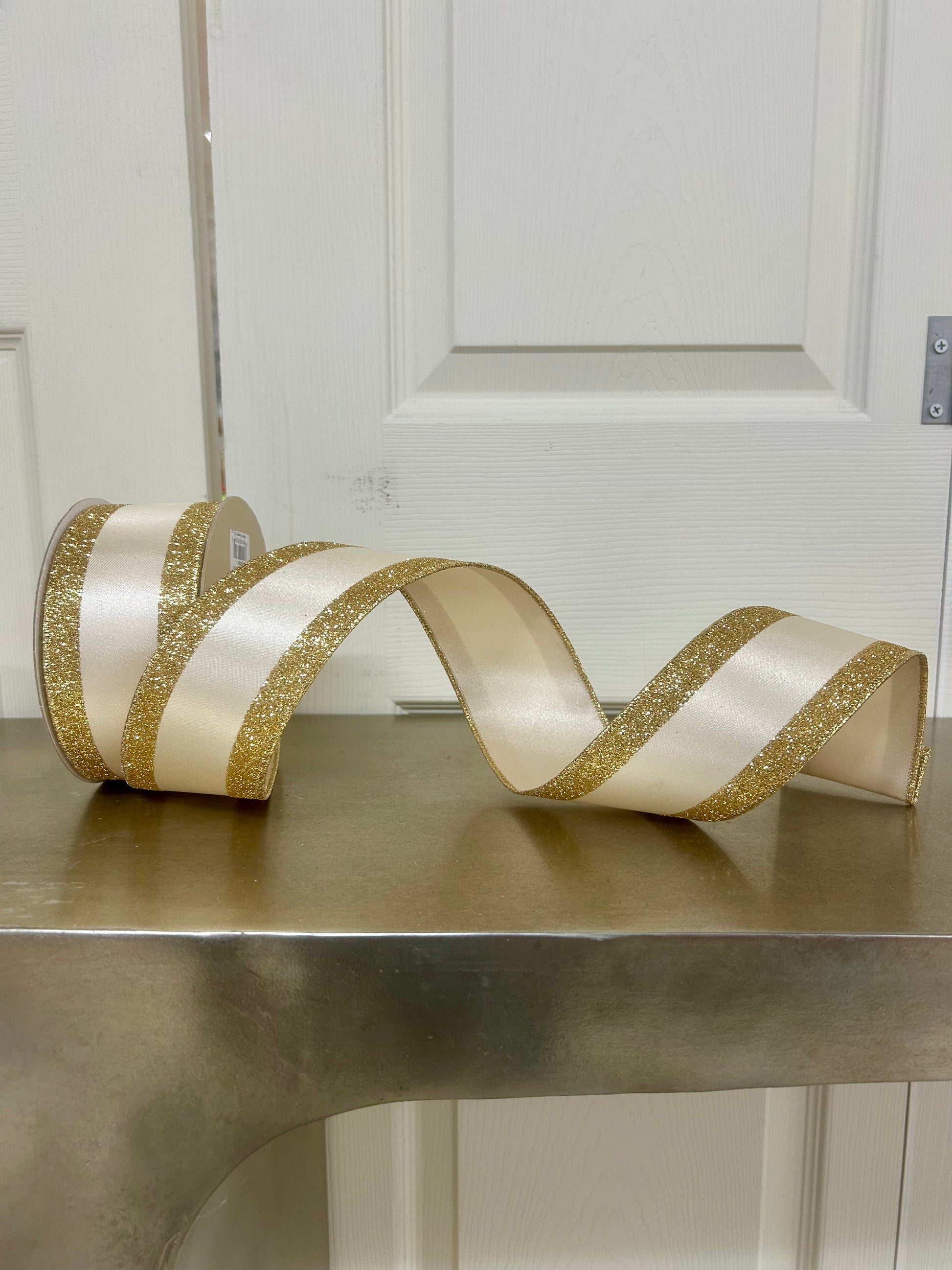 2.5 Inch By 10 Yard Ivory And Gold Vertical Glitter Stripe Sewn Ribbon