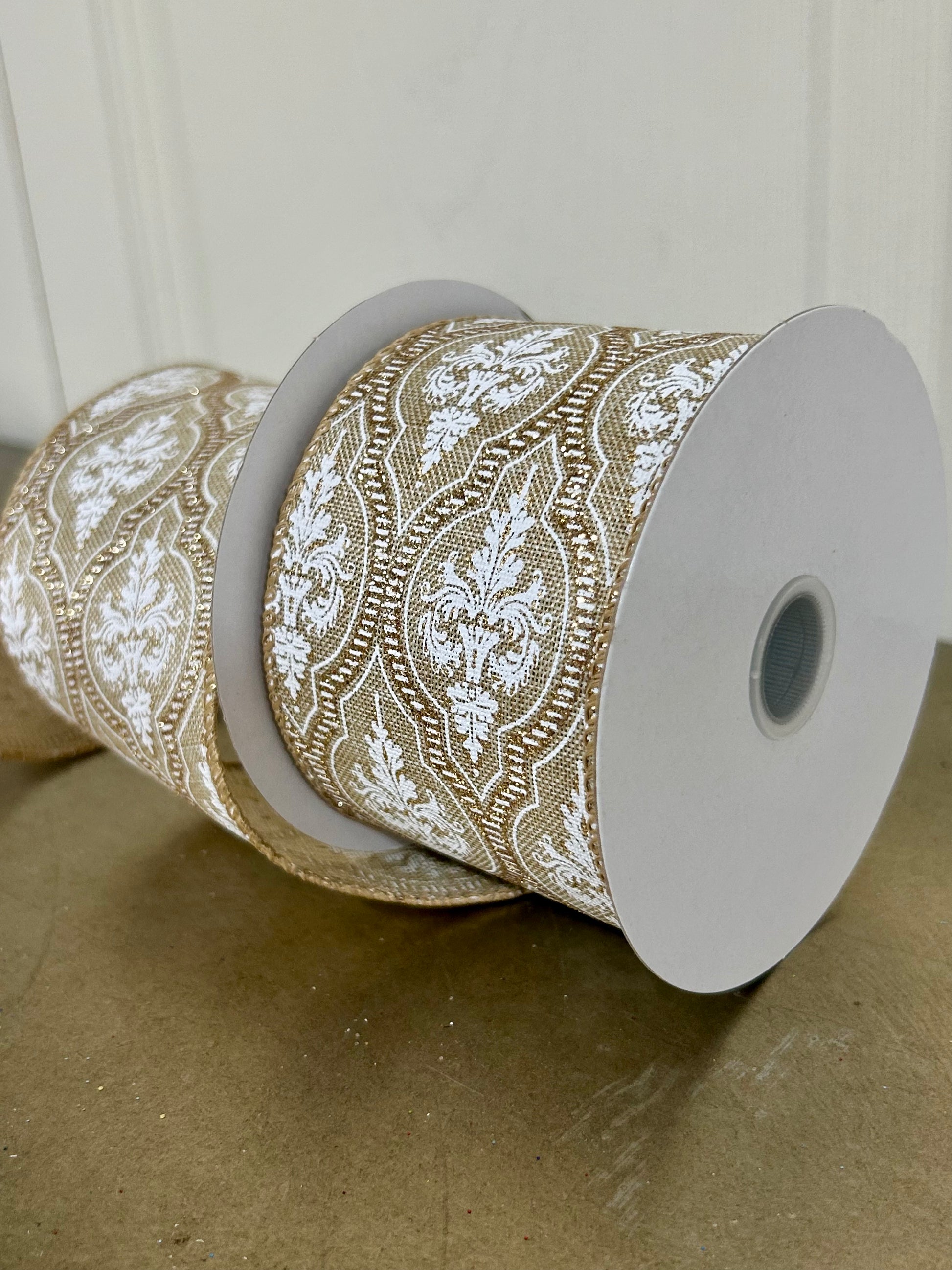 2.5 Inch By 10 Yard Natural Linen Demask Quatrefoil Ribbon