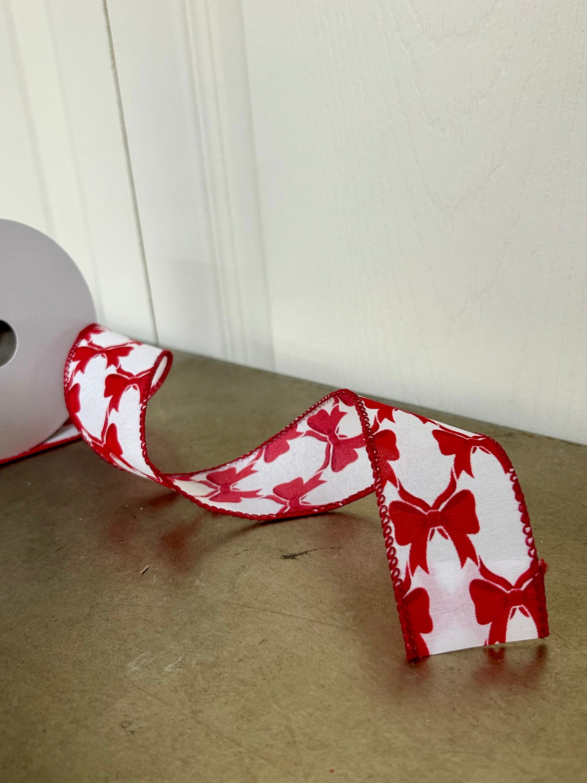 This 1.5-inch wired ribbon features a crisp white background accentuated by vibrant red bows and red edging. Perfect for festive occasions like Christmas and Valentine's Day, its wired design allows for easy shaping and secure bows, making it ideal for decorating wreaths, gifts, or floral arrangements with a professional finish.