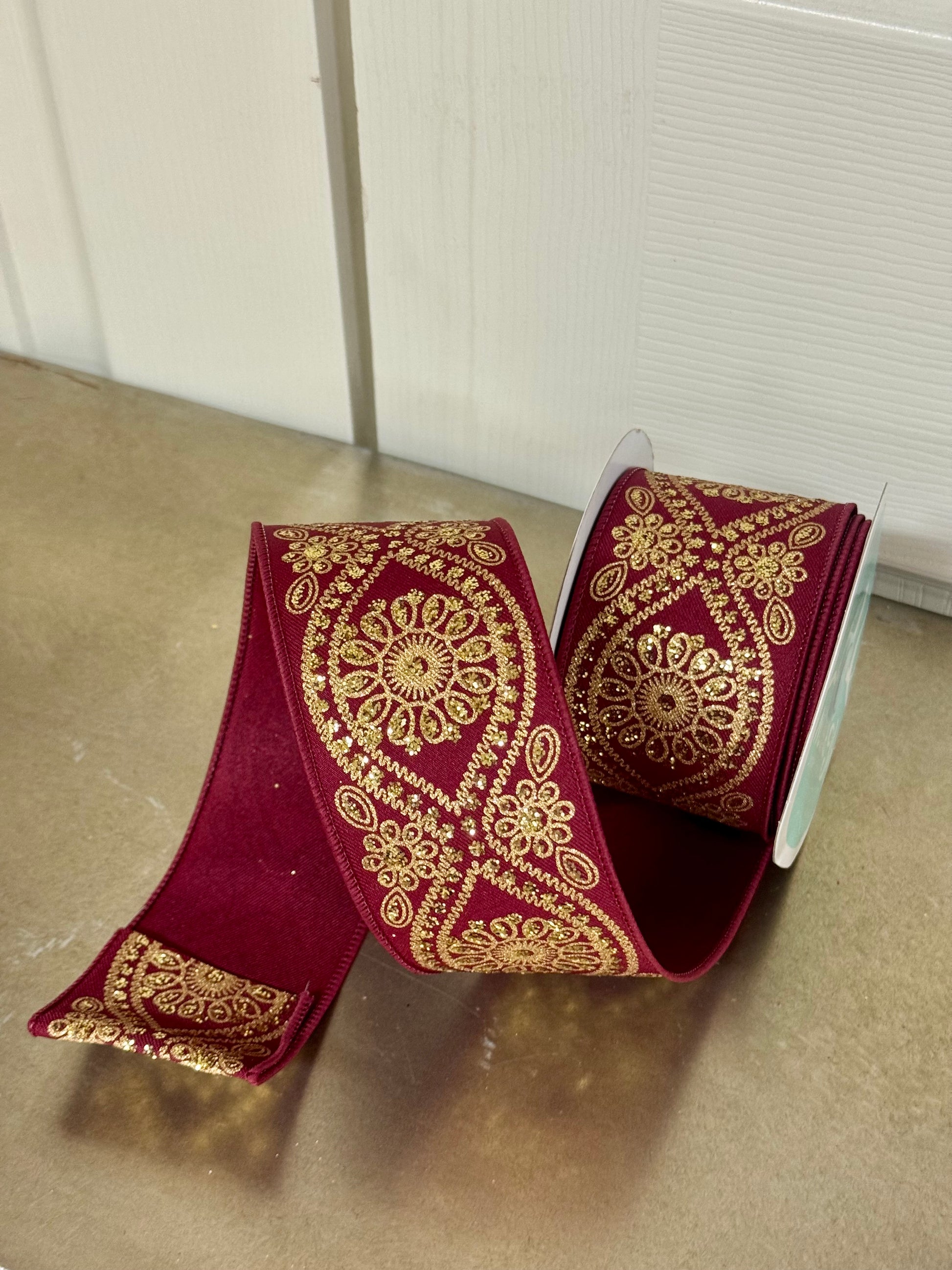 2.5 Inch By 10 Yard Wine And Gold Deluxe Wavy Floral Ribbon