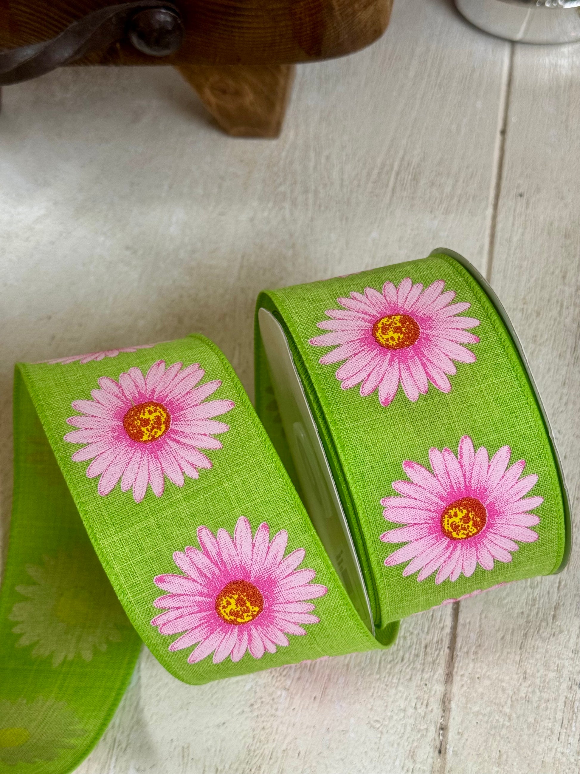 2.5 Inch By 20 Yard Pink And Lime Green Gerbera Daisy Ribbon