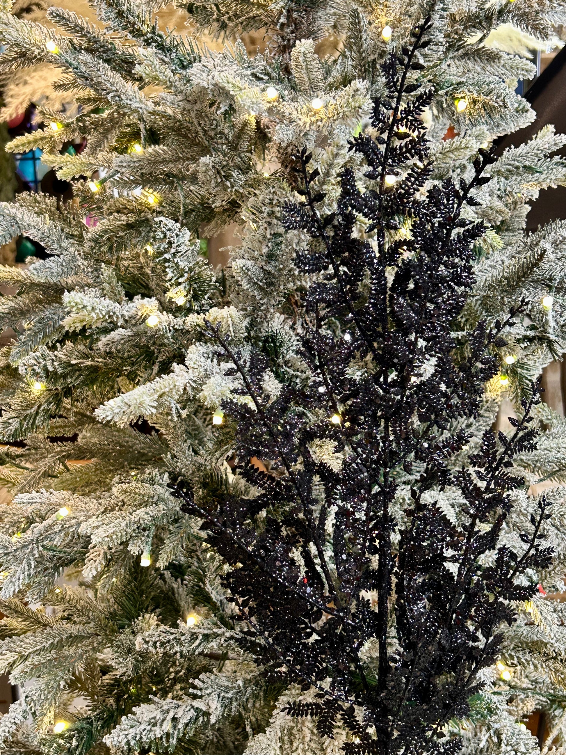 - The Glittered Fern Spray dazzles in deep black with shimmering accents, adding a sophisticated touch to holiday décor. Measuring 29 inches, its gracefully arching fronds create a refined, luminous accent for wreaths, garlands, centerpieces, or upscale seasonal arrangements.