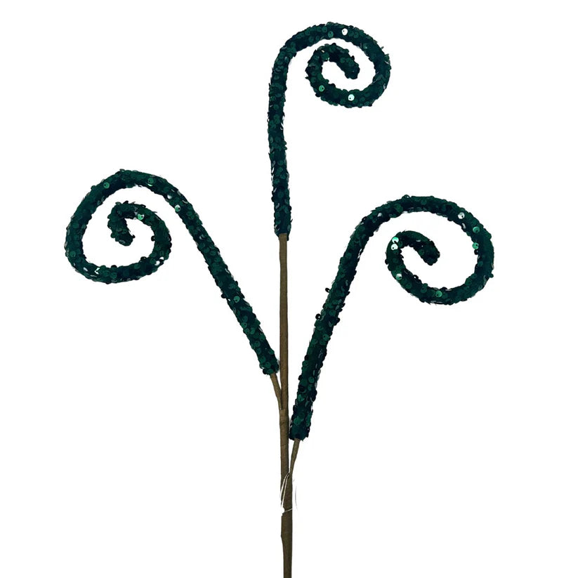 - Add a touch of dramatic elegance to your décor with this Velvet Sequin Curl Spray. Measuring 29 inches, it features rich dark green velvet curls accented with sparkling sequins, perfect for trees, wreaths, centerpieces, or glamorous holiday displays. A sophisticated accent that blends texture and shimmer beautifully.