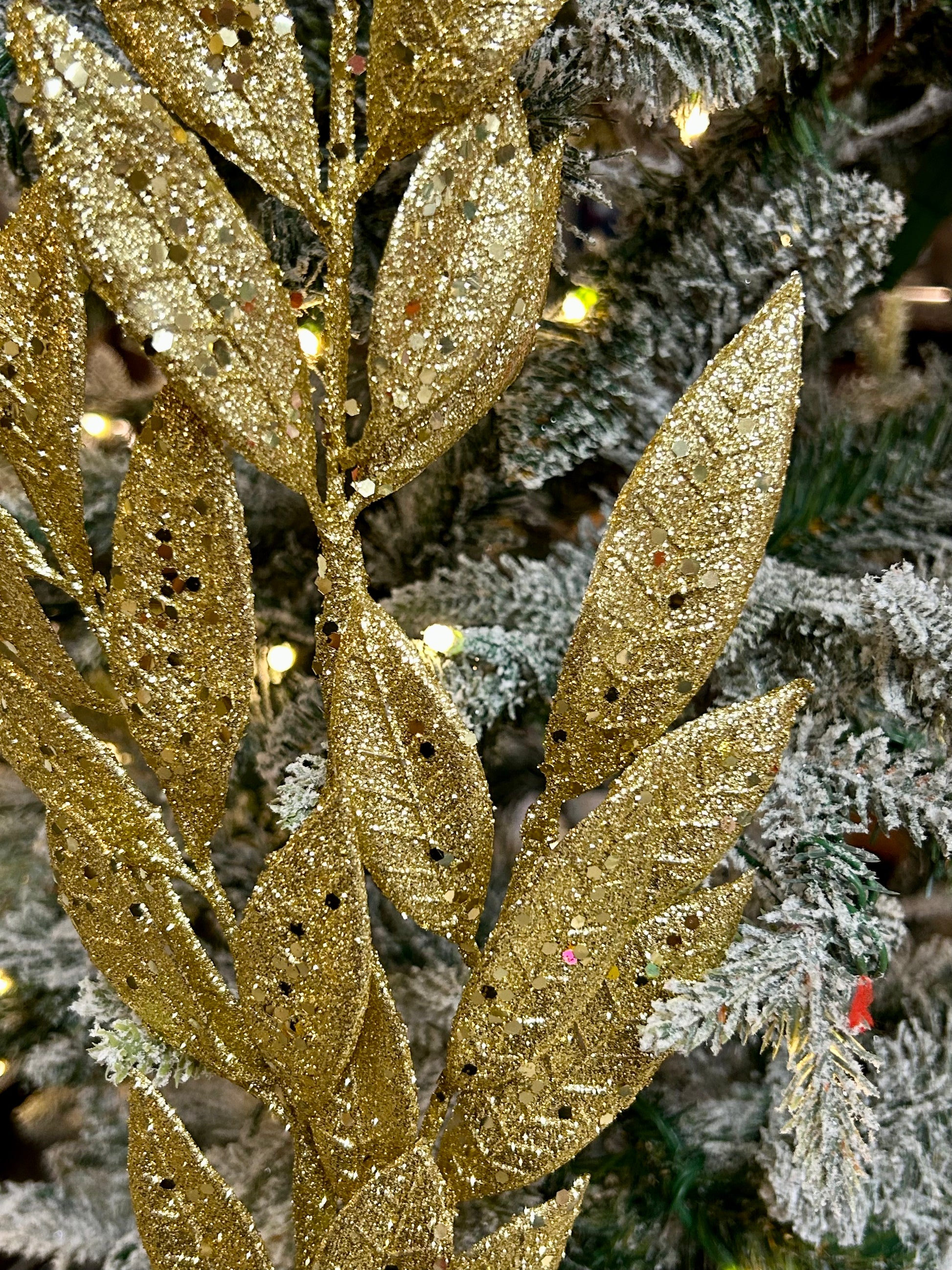 - Add some sparkle to your home with our Glitter Bay Leaf Spray! Standing at 29 inches tall, this spray is perfect for adding a touch of gold to your holiday decor or for adding a luxurious touch to any room. Its glittery leaves will catch the light and bring a festive and elegant ambiance to your space. Make a statement with this glamorous and versatile spray!