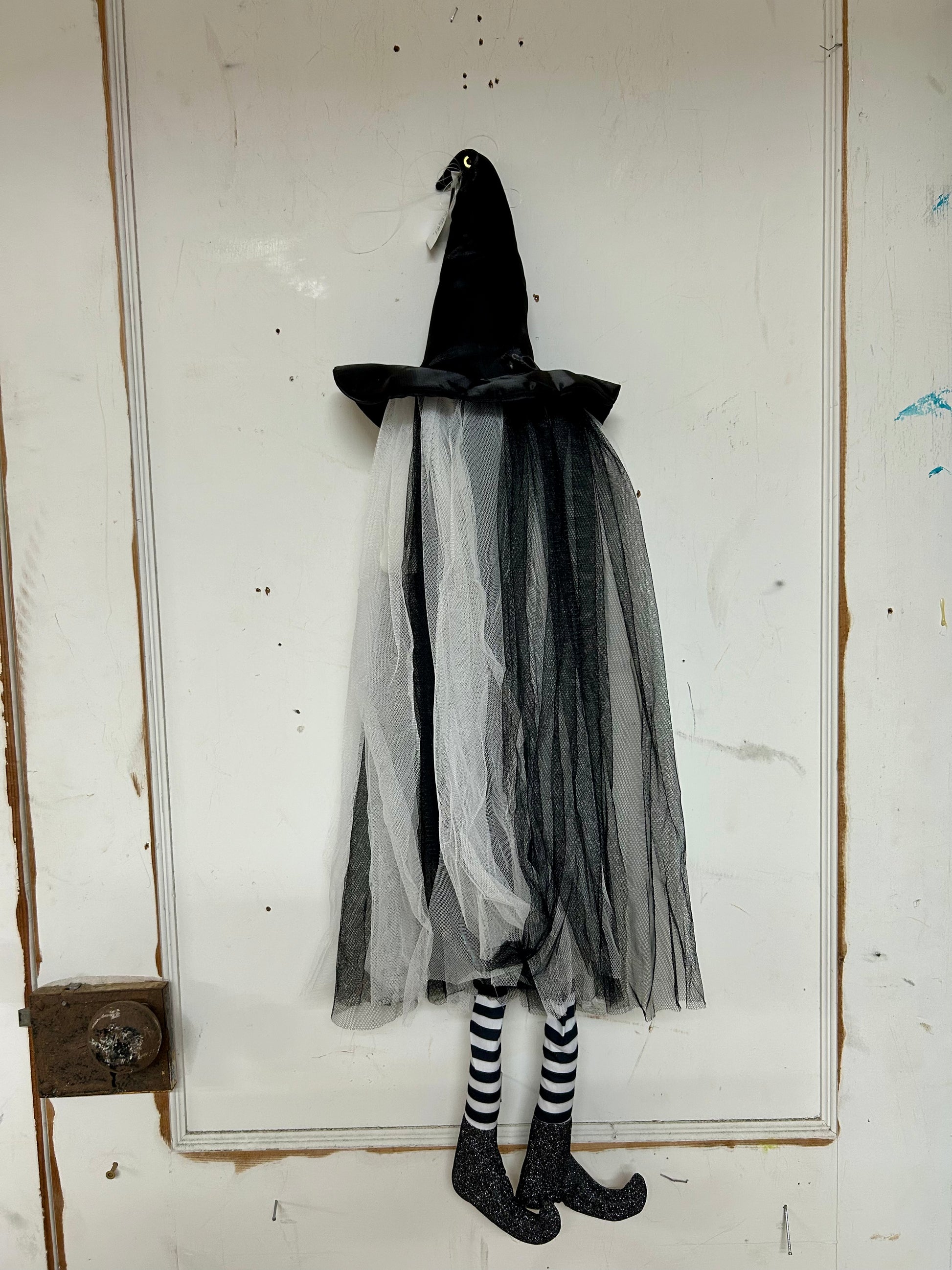 This 30-inch black and white hanging witch is an expertly crafted Halloween decoration that adds a spooky yet stylish touch to your seasonal décor. Its striking monochrome design makes it versatile for any Halloween theme, while the lightweight construction allows for easy hanging indoors or outdoors. Perfect for creating an eerie atmosphere, this decoration instantly elevates your Halloween display with a classic witch silhouette.