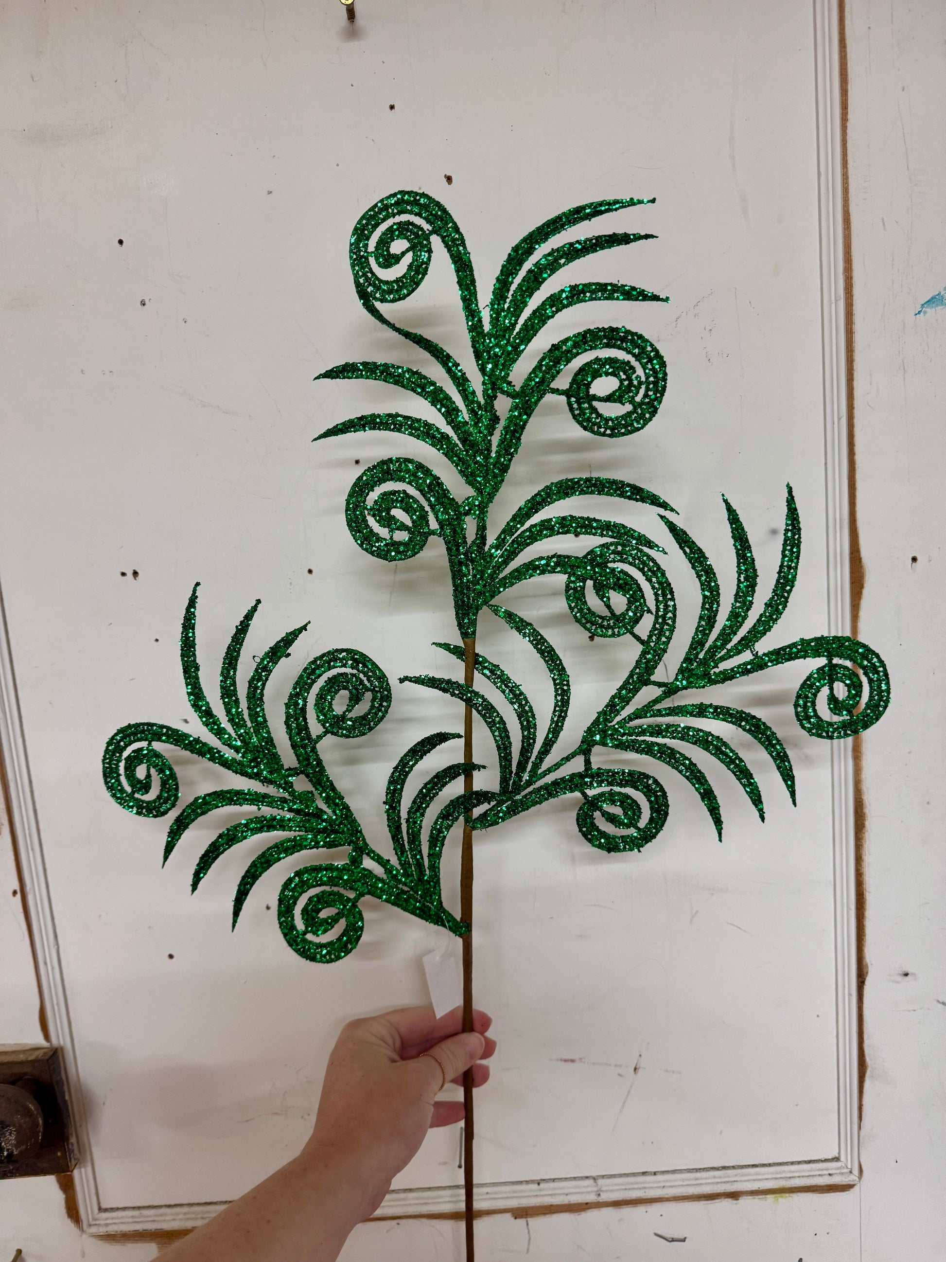 - Outfit Your Winter Decor With This Intricate Glittered Swirl Palm Spray! This Spray Has Twisted And Curled Palm Leaves Throughout, Colored In A Lovely Emerald Green And Dusted In Glitter To Give It Some Shine! This Spray Will Look Marvelous Around Other Pine Elements, Such As Garland Or A Wreath, And Will Benefit From Other Shiny Accents As Well! Consider Pairing This Spray With Some Tinsel, Or Other Glittered Pieces To Let Your Display Pop!