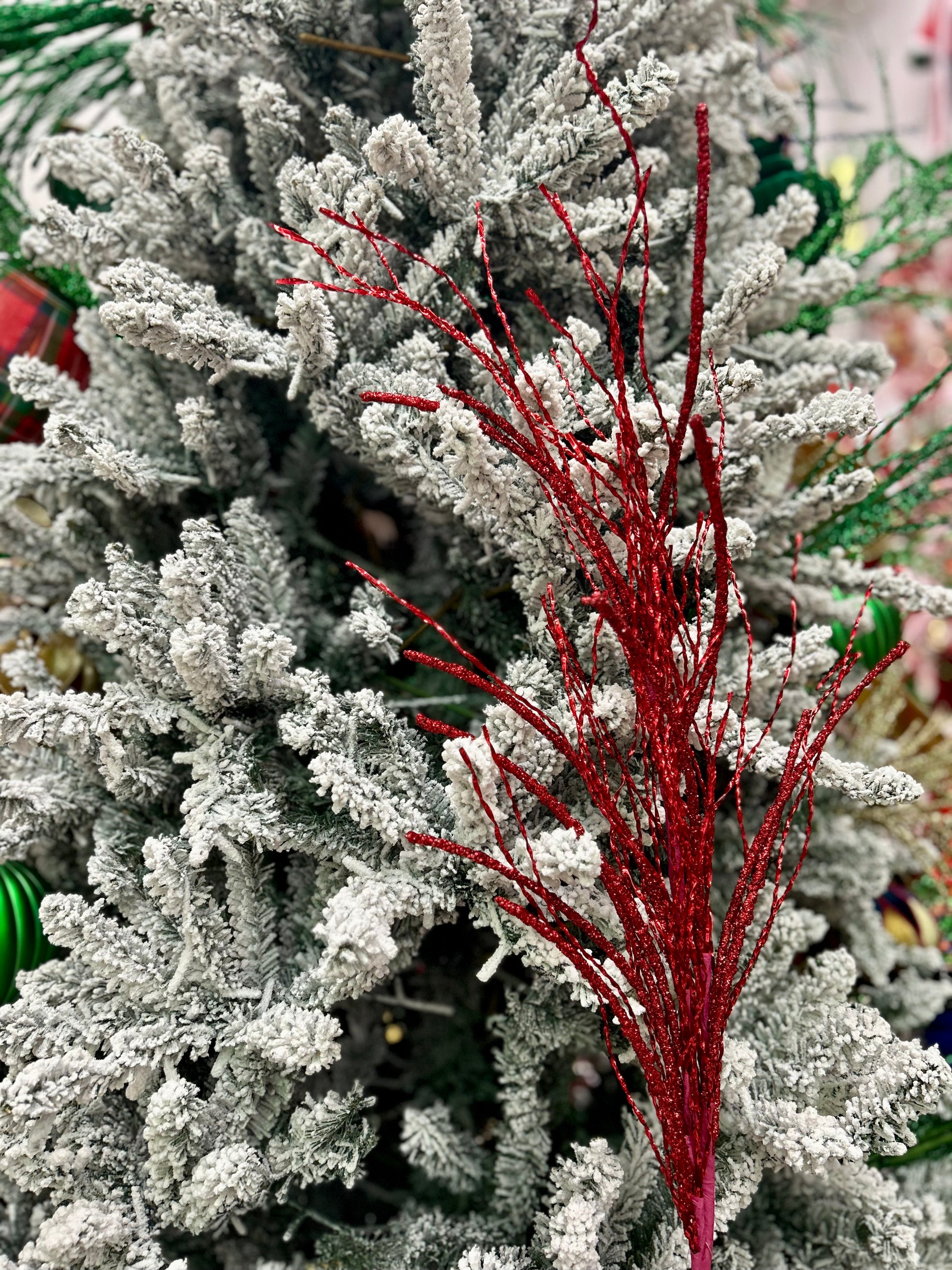Add a festive touch to your décor with this 38-inch Red Glitter Pine Twig Spray. Its vibrant red glitter finish enhances seasonal arrangements, making it ideal for Valentine's Day, patriotic celebrations, spring, summer, and Christmas decorations. Crafted to seamlessly blend with wreaths, centerpieces, and floral designs, this spray adds texture and sparkle to any setting, elevating your seasonal displays with expert elegance.