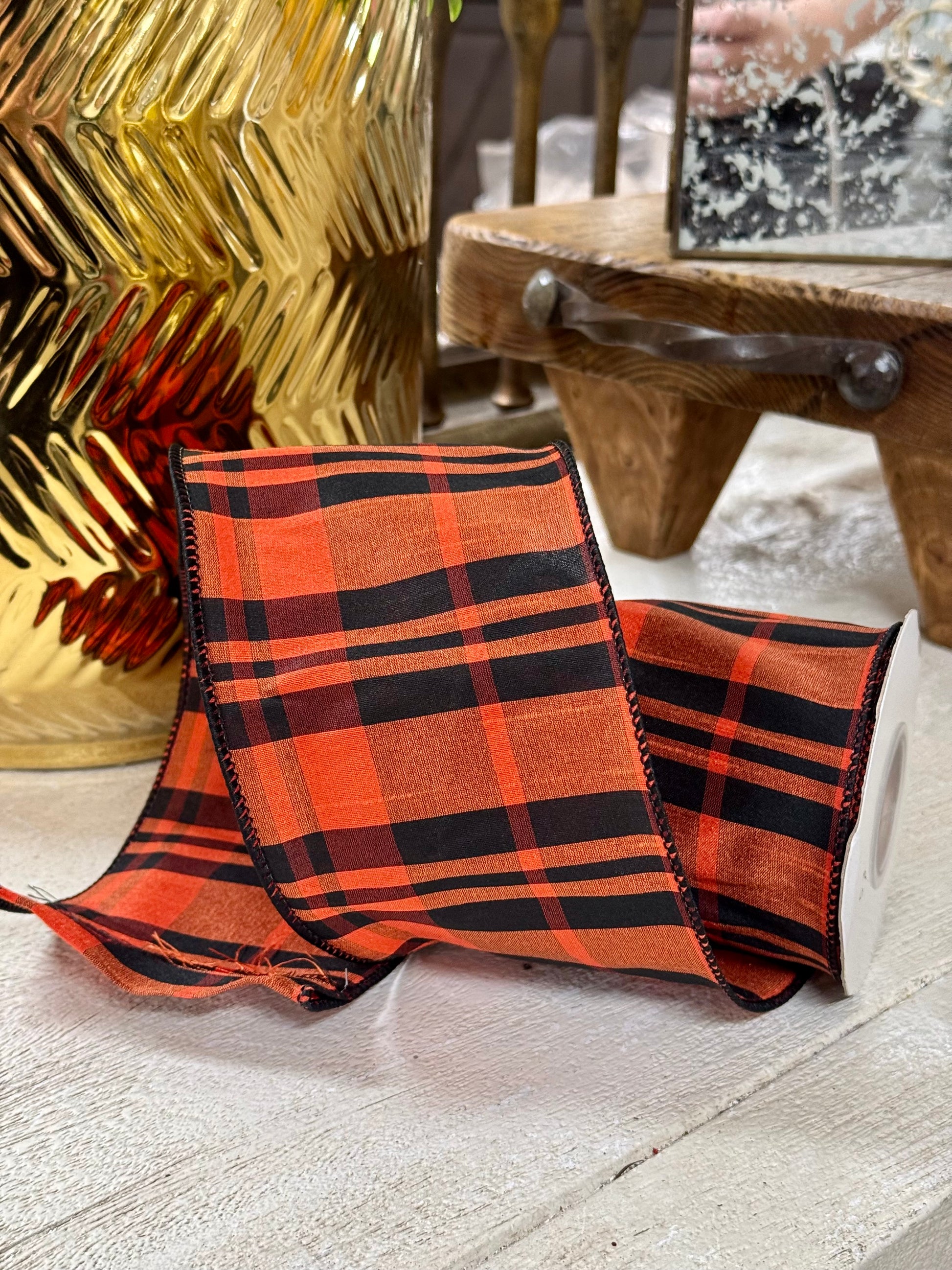 4 Inch By 10 Yard Burnt Orange And Black Dupioni Plaid Ribbon